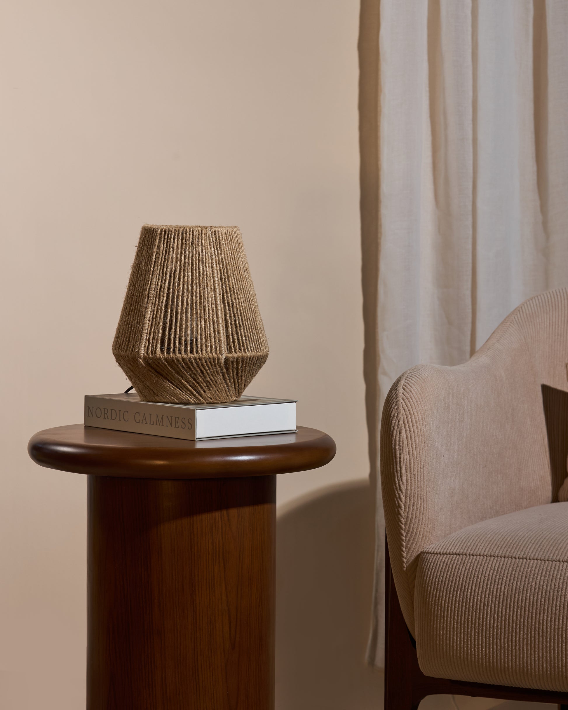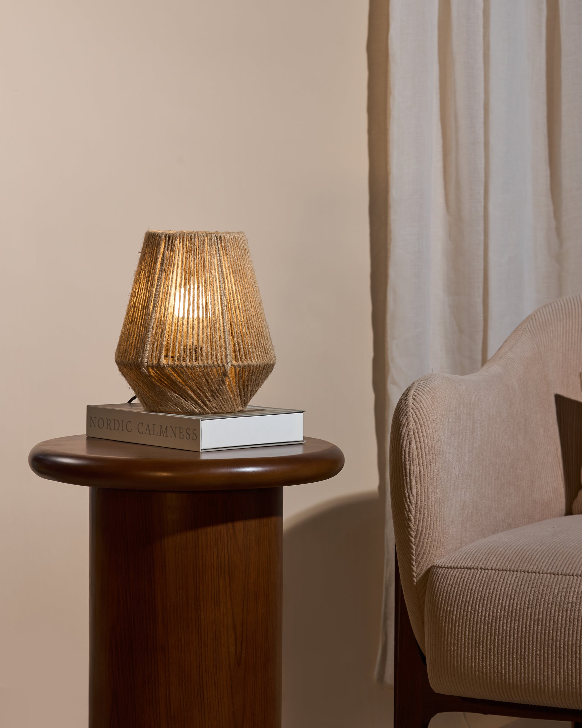 Een handgemaakte tafellamp met een speelse geometrische vorm, bekleed met grove jute touw. De open structuur laat het licht sfeervol door en zorgt voor warme schaduwen in de ruimte. Een echte sfeermaker voor een natuurlijke en serene uitstraling.