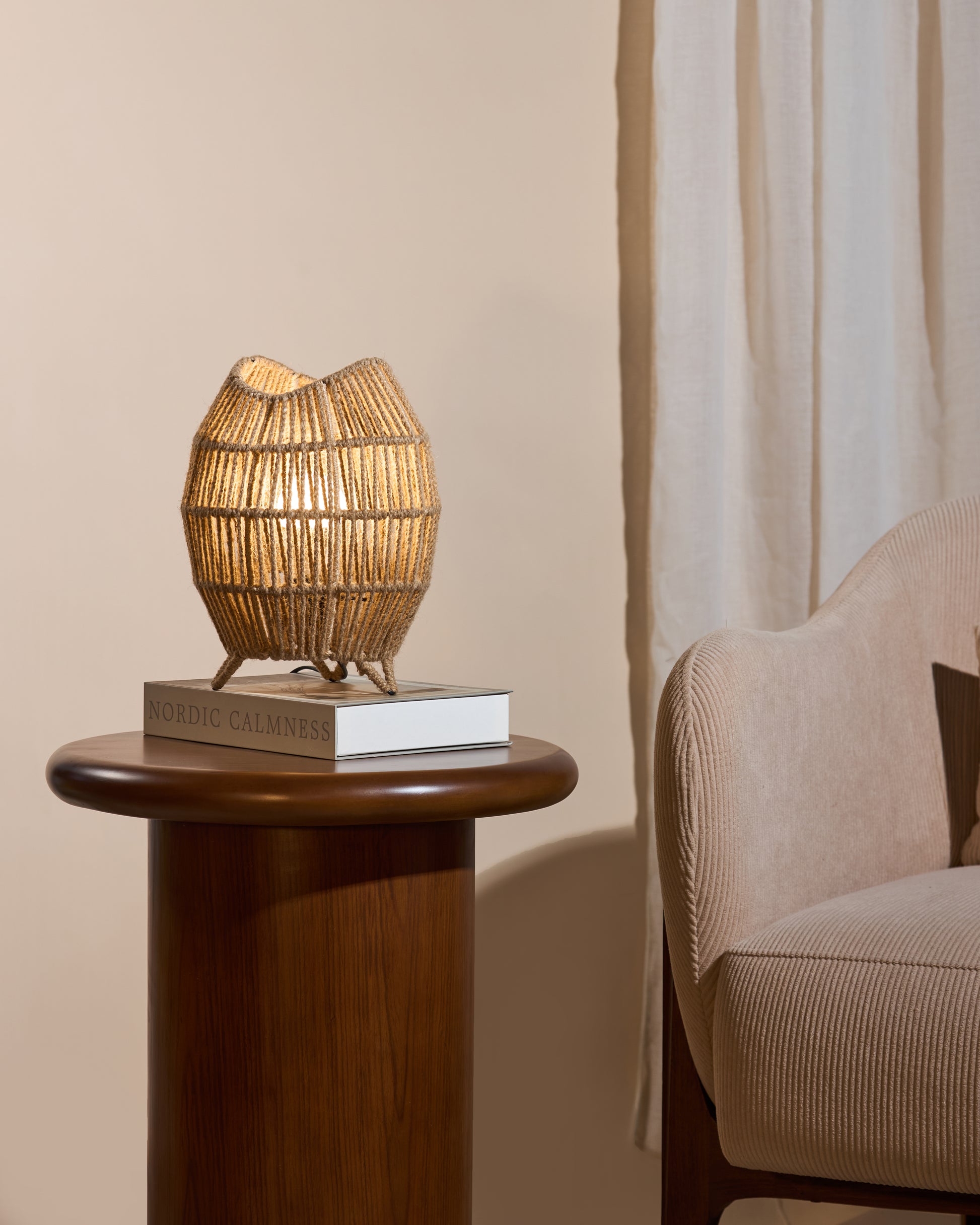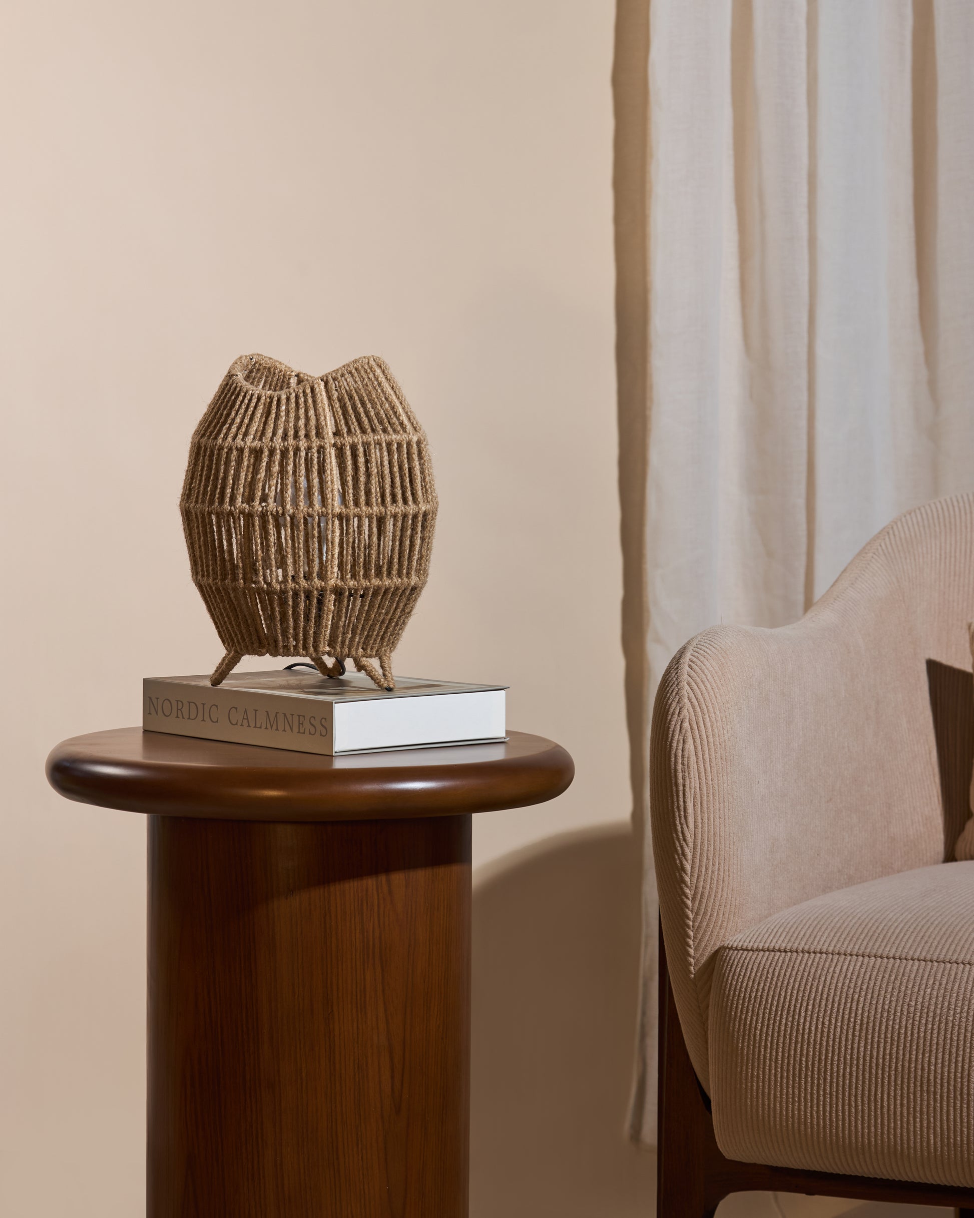 Deze speelse tafellamp trekt de aandacht met zijn unieke, golvende silhouet. Met de hand vervaardigd uit jute touw, creëert het open vlechtwerk een warme en uitnodigende gloed. Een karaktervol designstuk dat zachtheid en textuur brengt in elke ruimte.