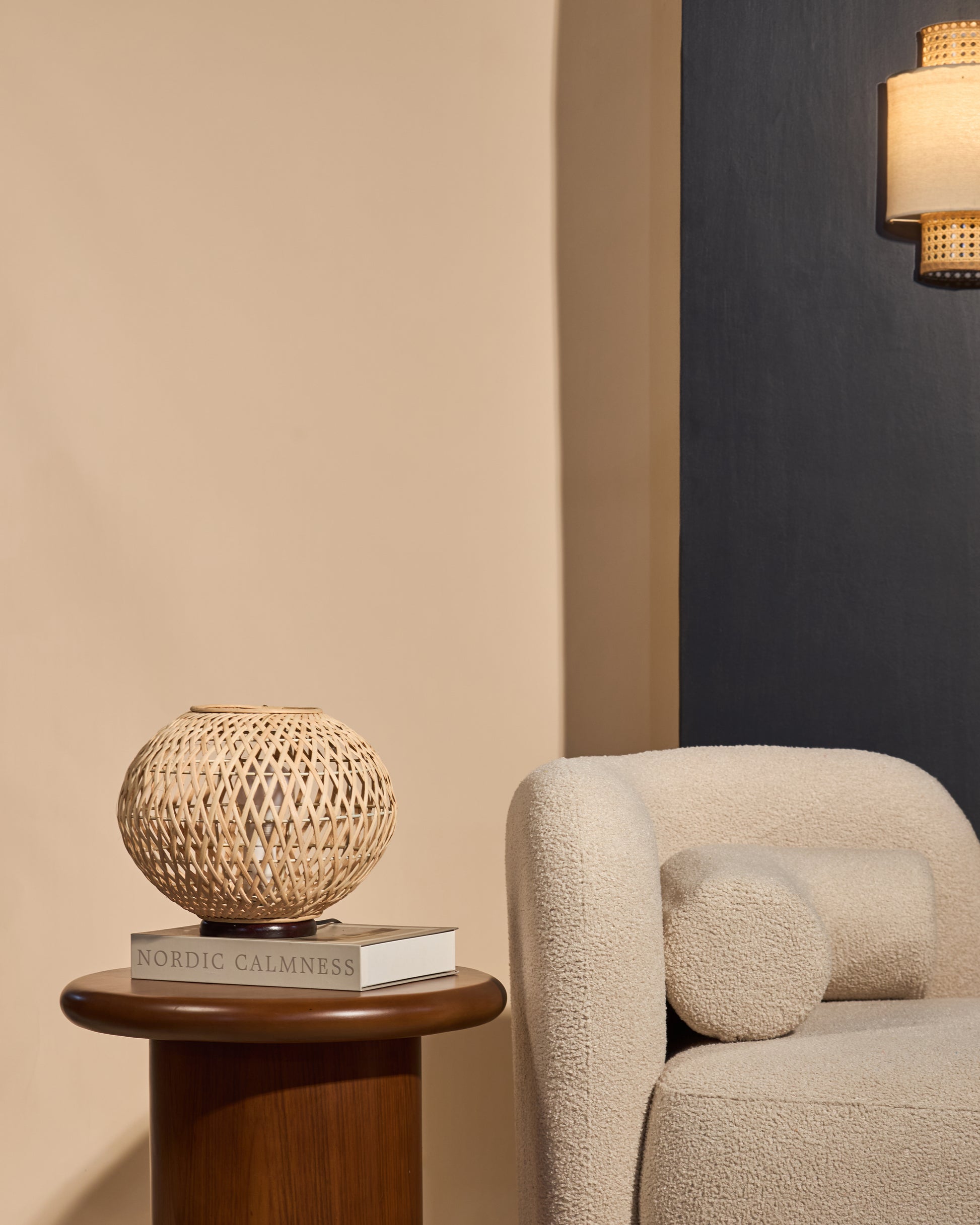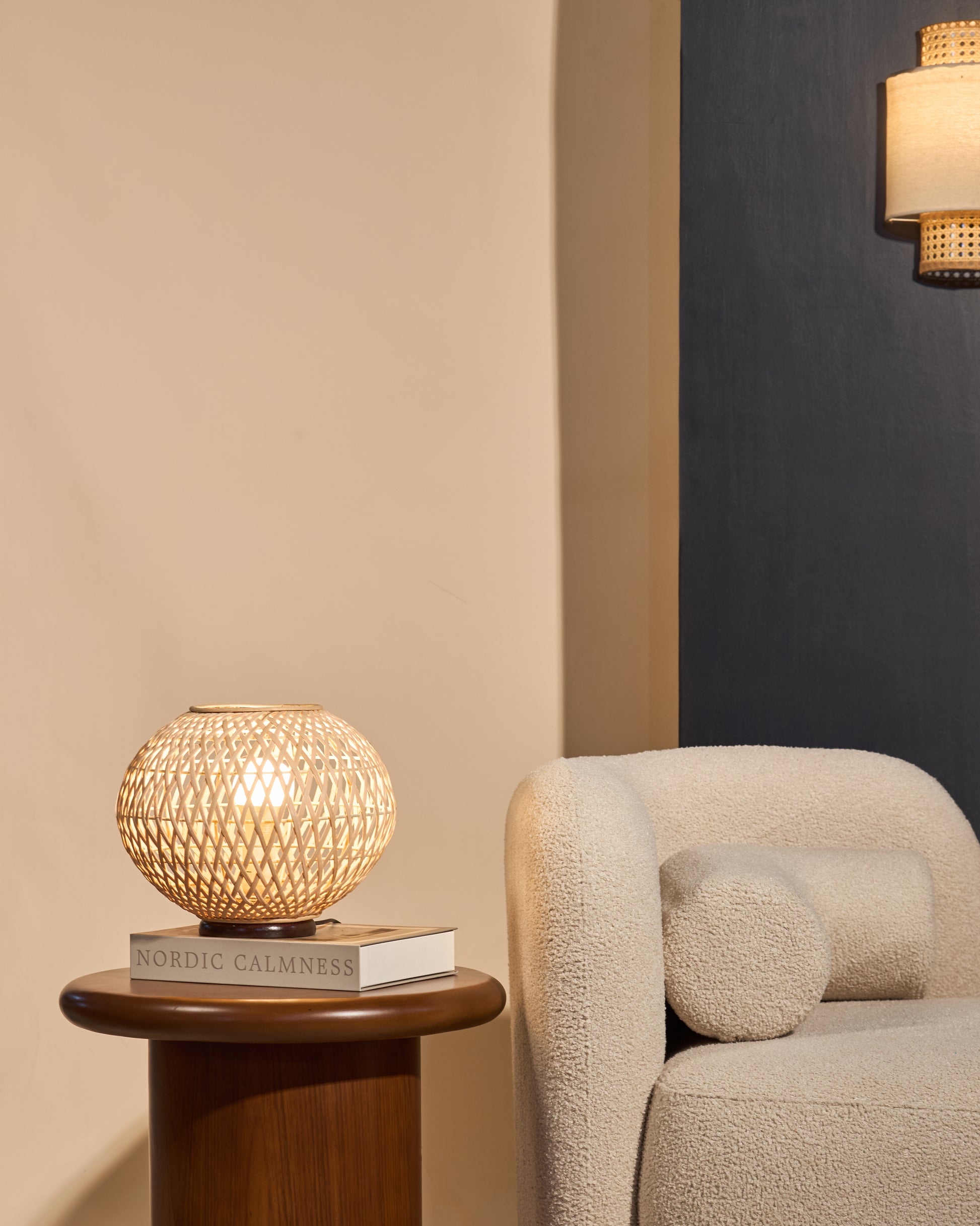 Een elegante tafellamp met een bolvormig design dat rust en warmte uitstraalt. De open geweven structuur van bamboe laat het licht op zachte wijze door en zorgt voor een sfeervol patroon in de ruimte. Perfect voor een gezellige hoek in je woonkamer of slaapkamer. Handgemaakt met aandacht voor elk detail.