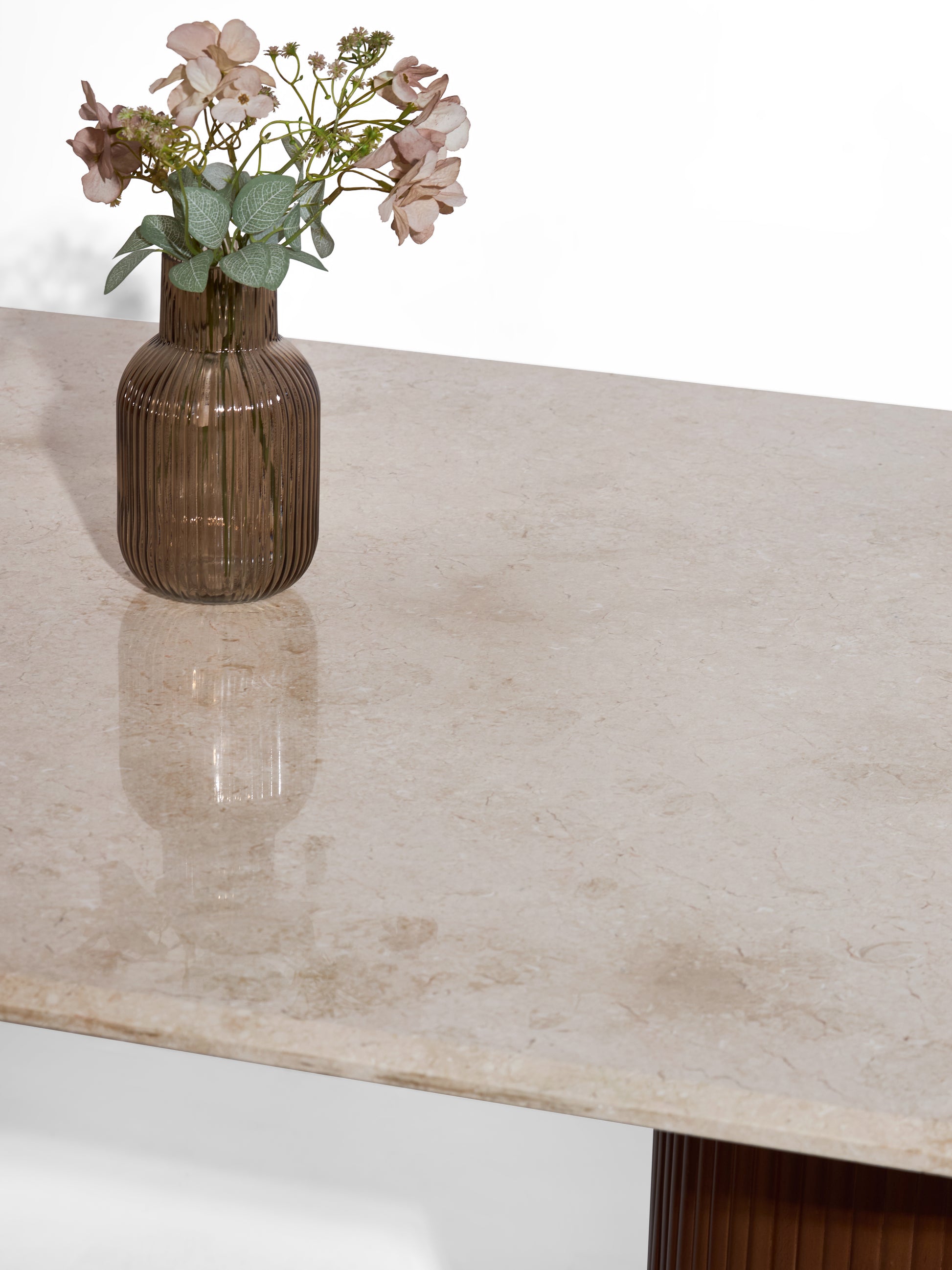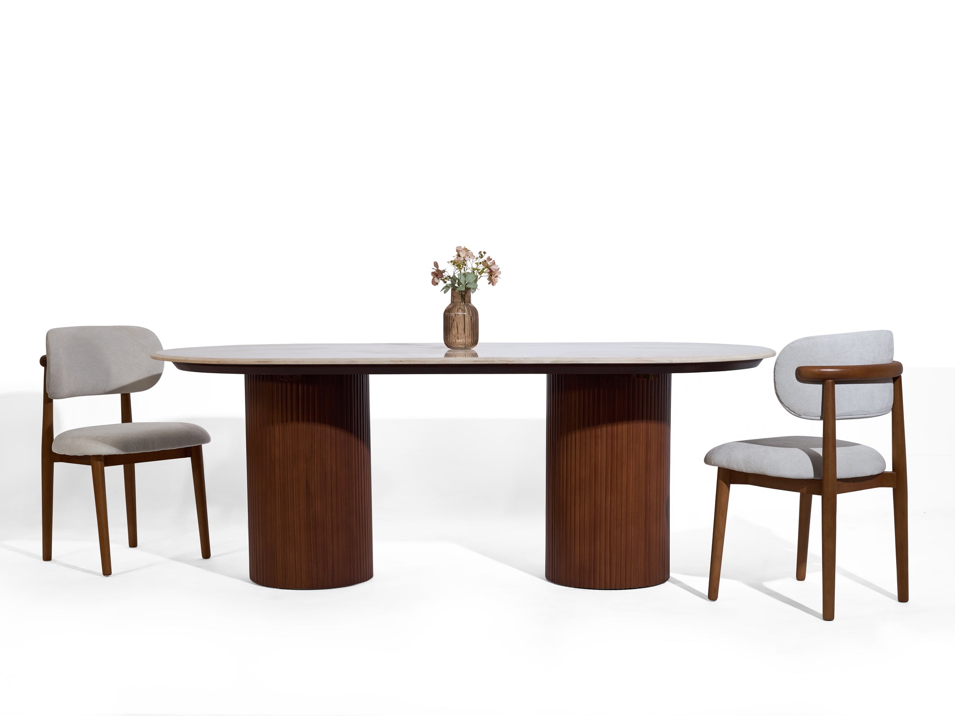 Deze royale ovale eettafel van Sicilia-marmer is een echte blikvanger. Het gladde marmeren blad rust op twee stevige houten zuilen met fijne verticale lijnen, wat de tafel een krachtige maar verfijnde uitstraling geeft.