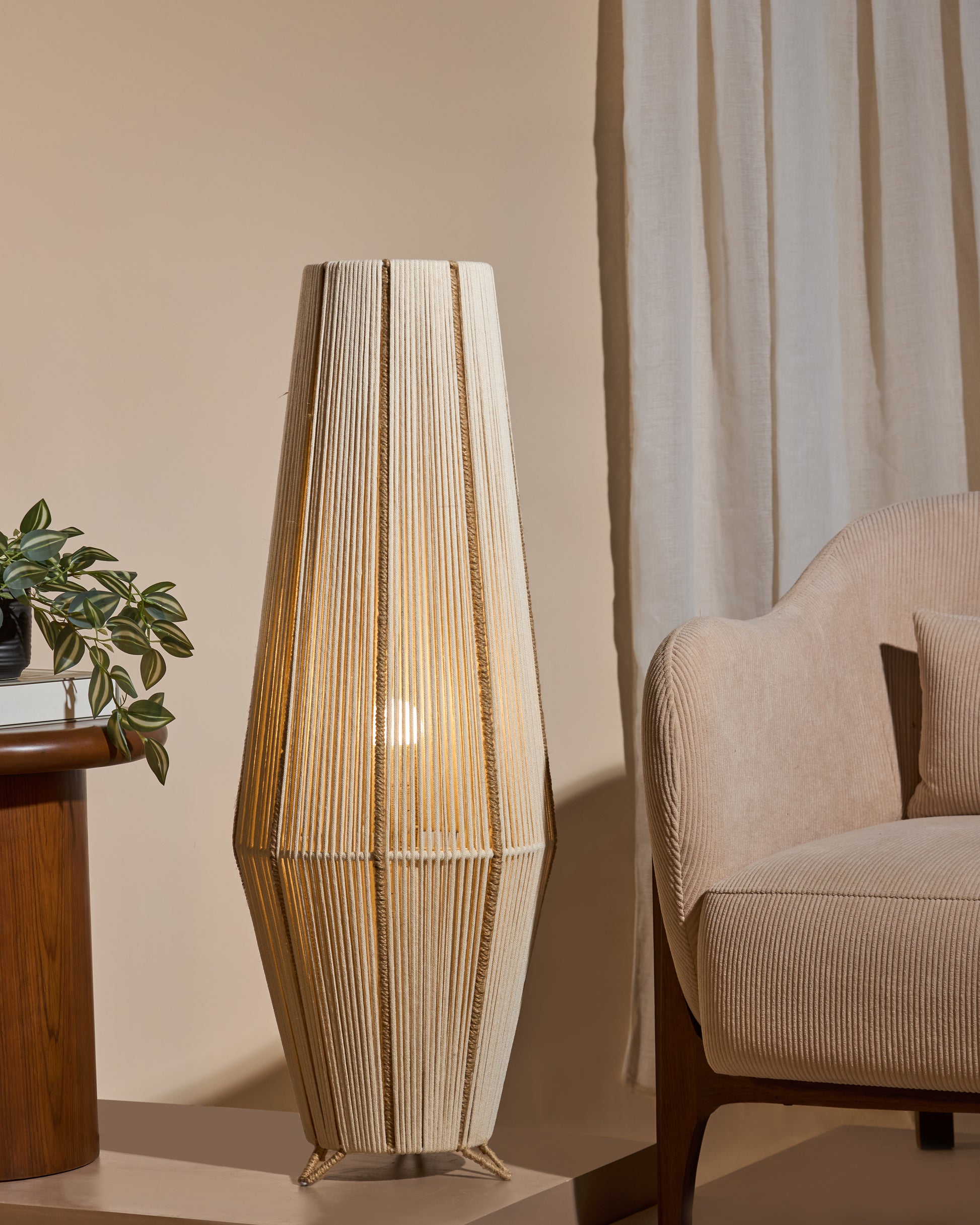 Met zijn sculpturale silhouet van 80 cm hoog is deze vloerlamp een echte blikvanger in huis. De kap is zorgvuldig met de hand omwikkeld in fijne lichtgekleurde touwstructuur, wat zorgt voor een warme en natuurlijke uitstraling. Dankzij de hoge vorm en het slanke ontwerp staat hij prachtig naast een fauteuil of in een lege hoek. Perfect om sfeer toe te voegen zonder te domineren.