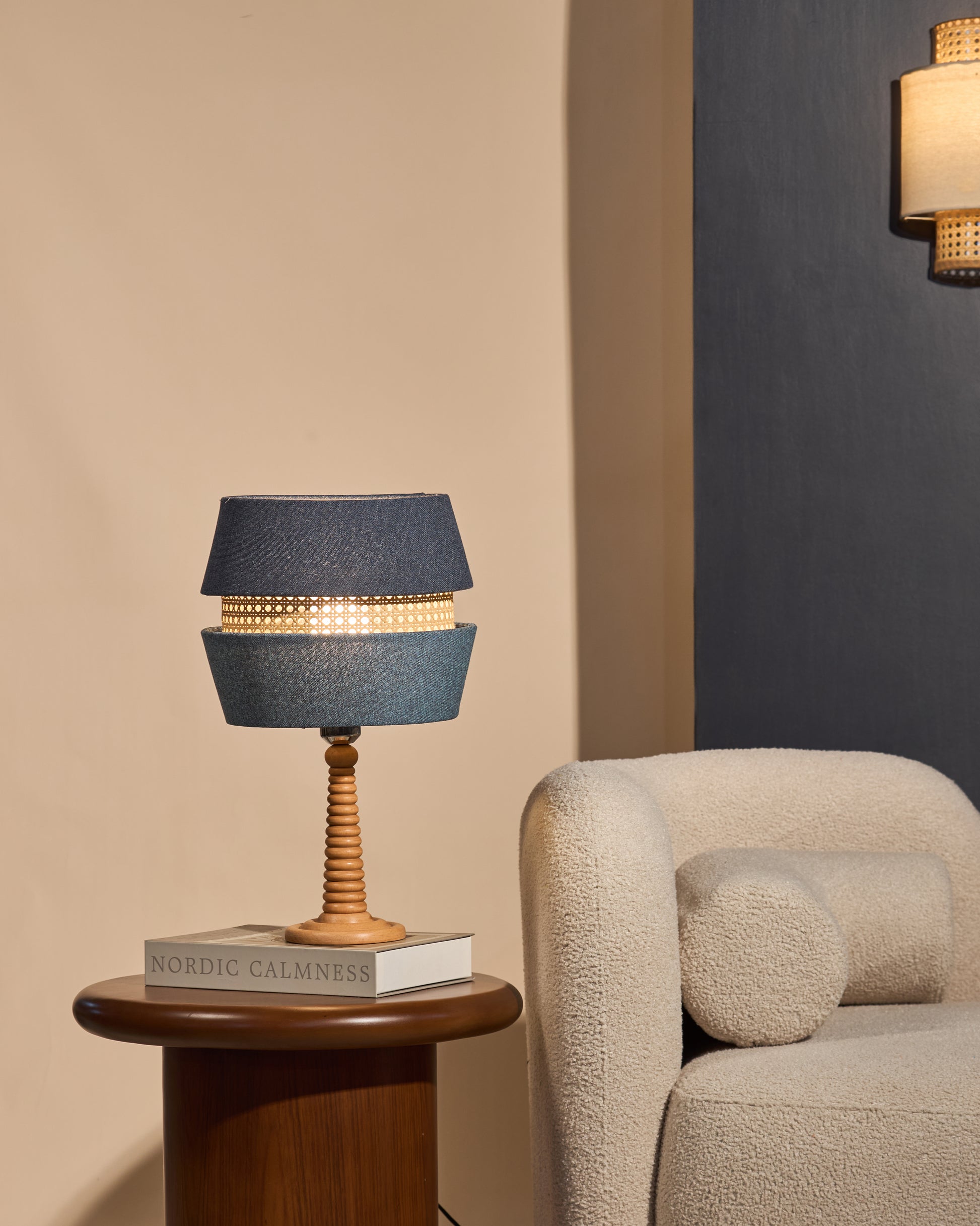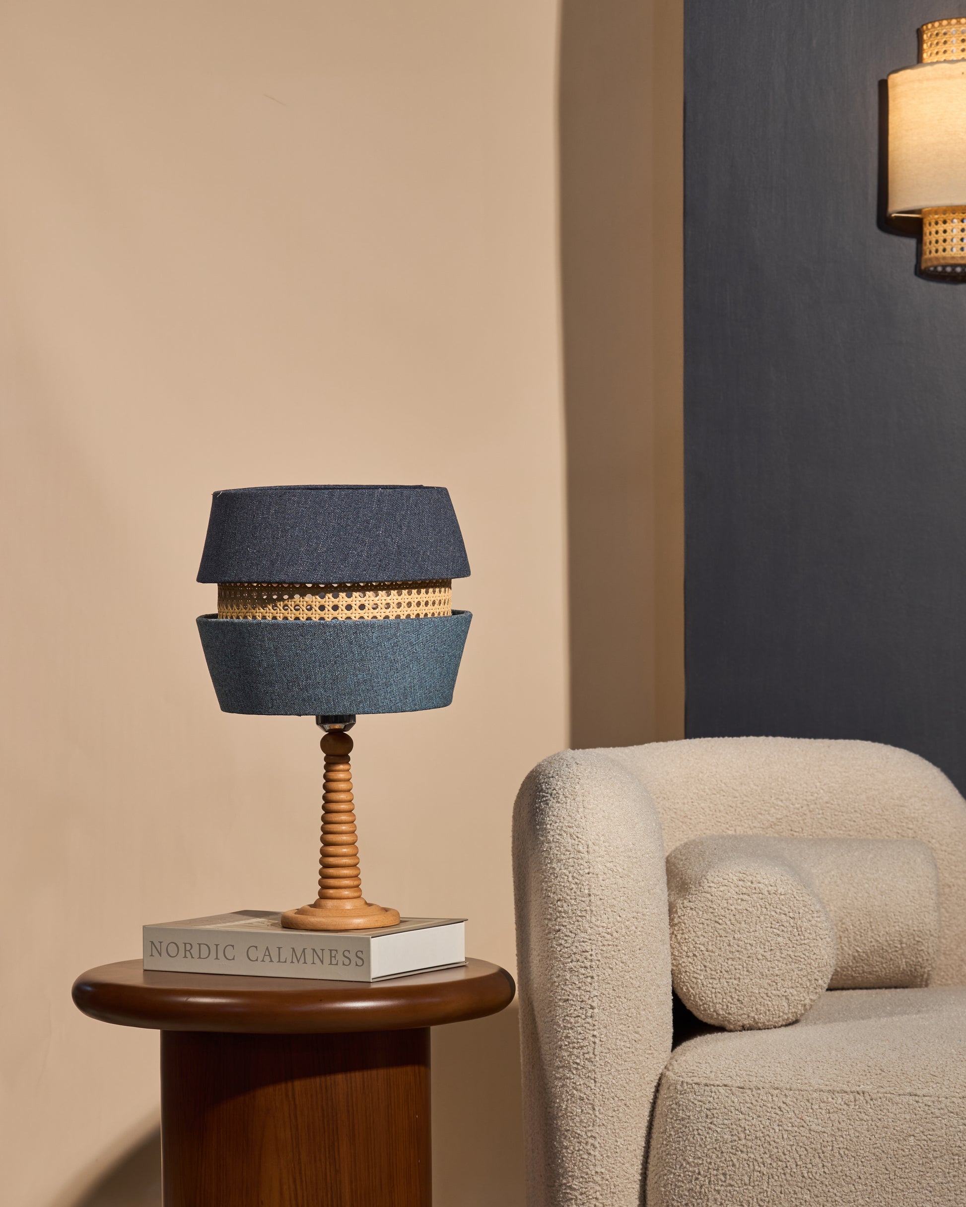 Een karaktervolle tafellamp die textiel, rotan en hout moeiteloos combineert. De blauwe stoffen kap contrasteert subtiel met het fijne opengewerkte middenstuk, wat een warm en speels licht verspreidt. Een unieke eyecatcher voor wie houdt van detail en ambacht.