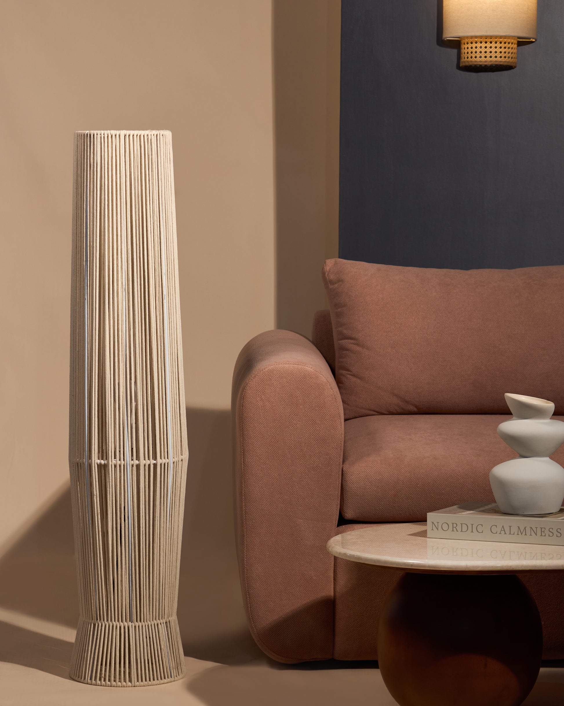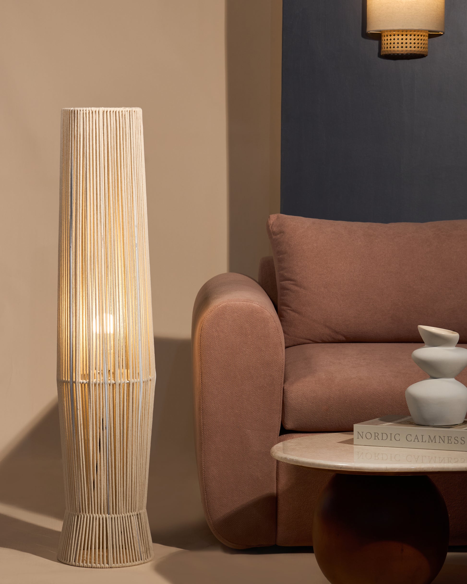 Met zijn elegante hoogte van 120 cm trekt deze vloerlamp op subtiele wijze de aandacht. De strakke, taps toelopende vorm wordt volledig met de hand gewikkeld in een fijne, lichte draadstructuur die zorgt voor een zachte spreiding van het licht. Een tijdloos stuk dat perfect staat naast een fauteuil of in een rustige hoek van de kamer.