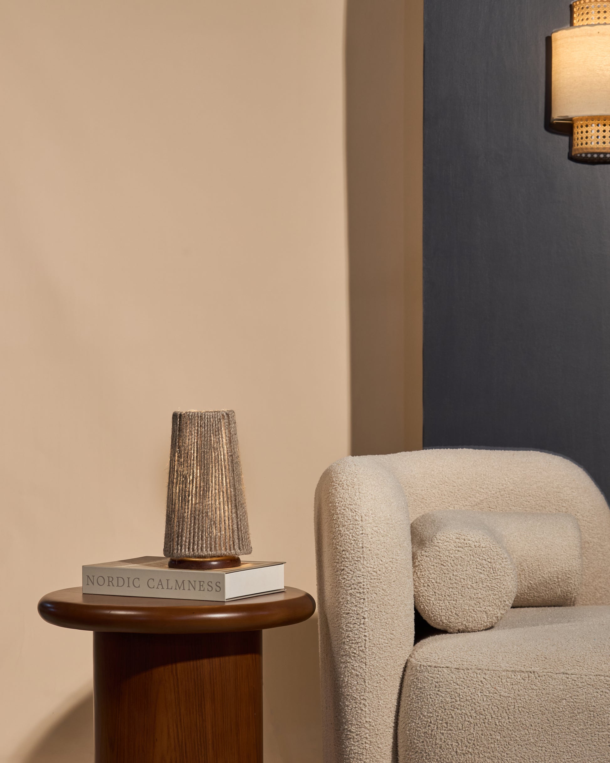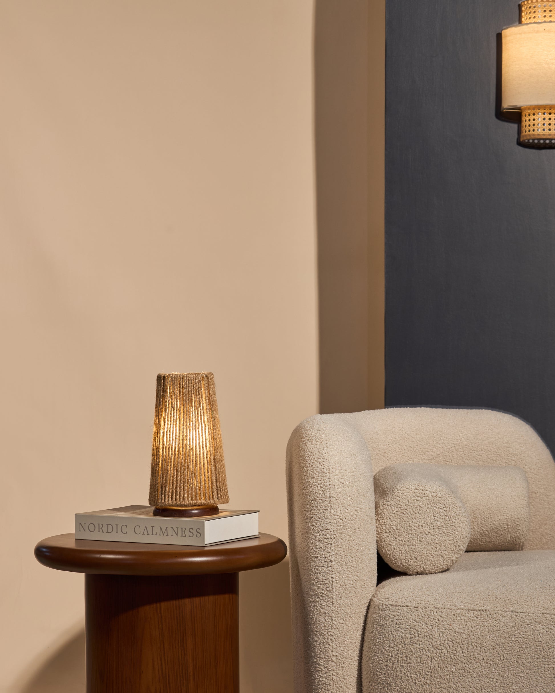 Een verfijnde tafellamp met een slank, taps toelopend design. De warme kleur van het jute touw filtert het licht zachtjes en zorgt voor een rustgevende sfeer. Met de hand gemaakt en perfect voor wie houdt van eenvoud met karakter.
