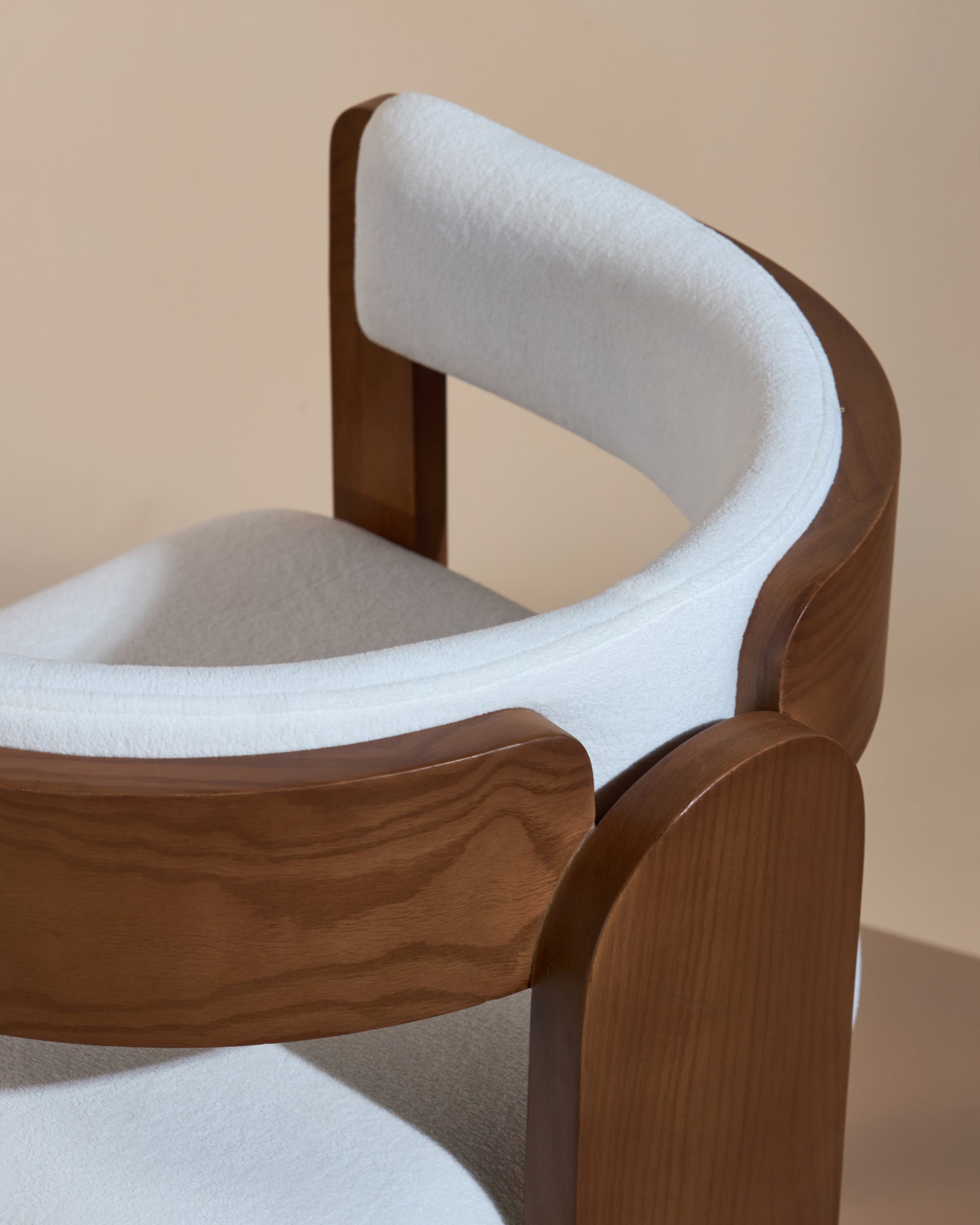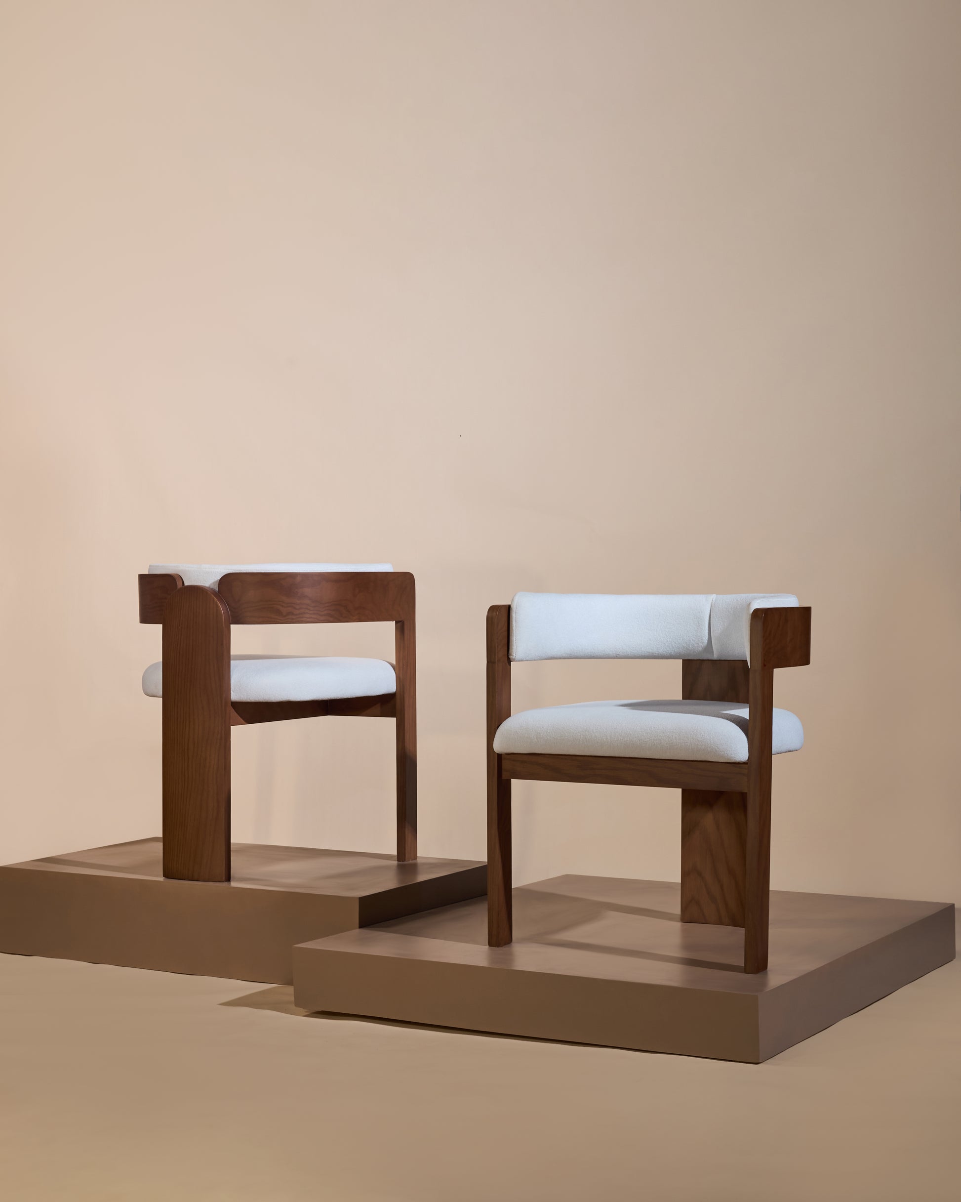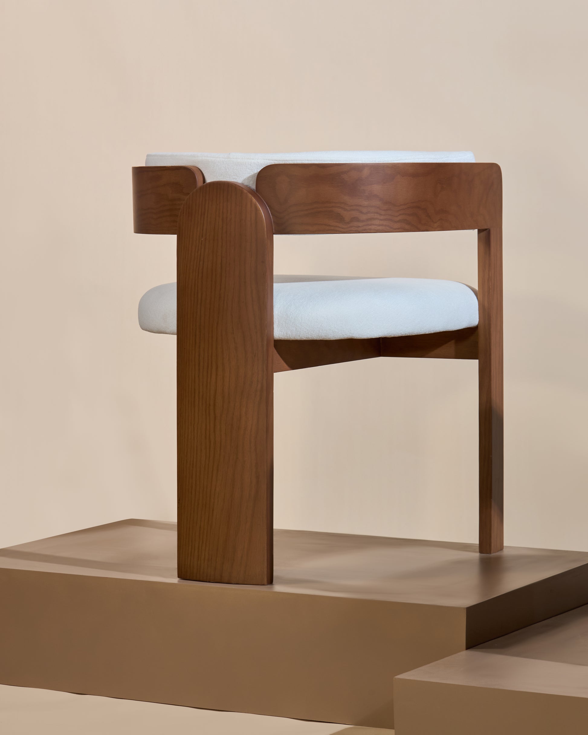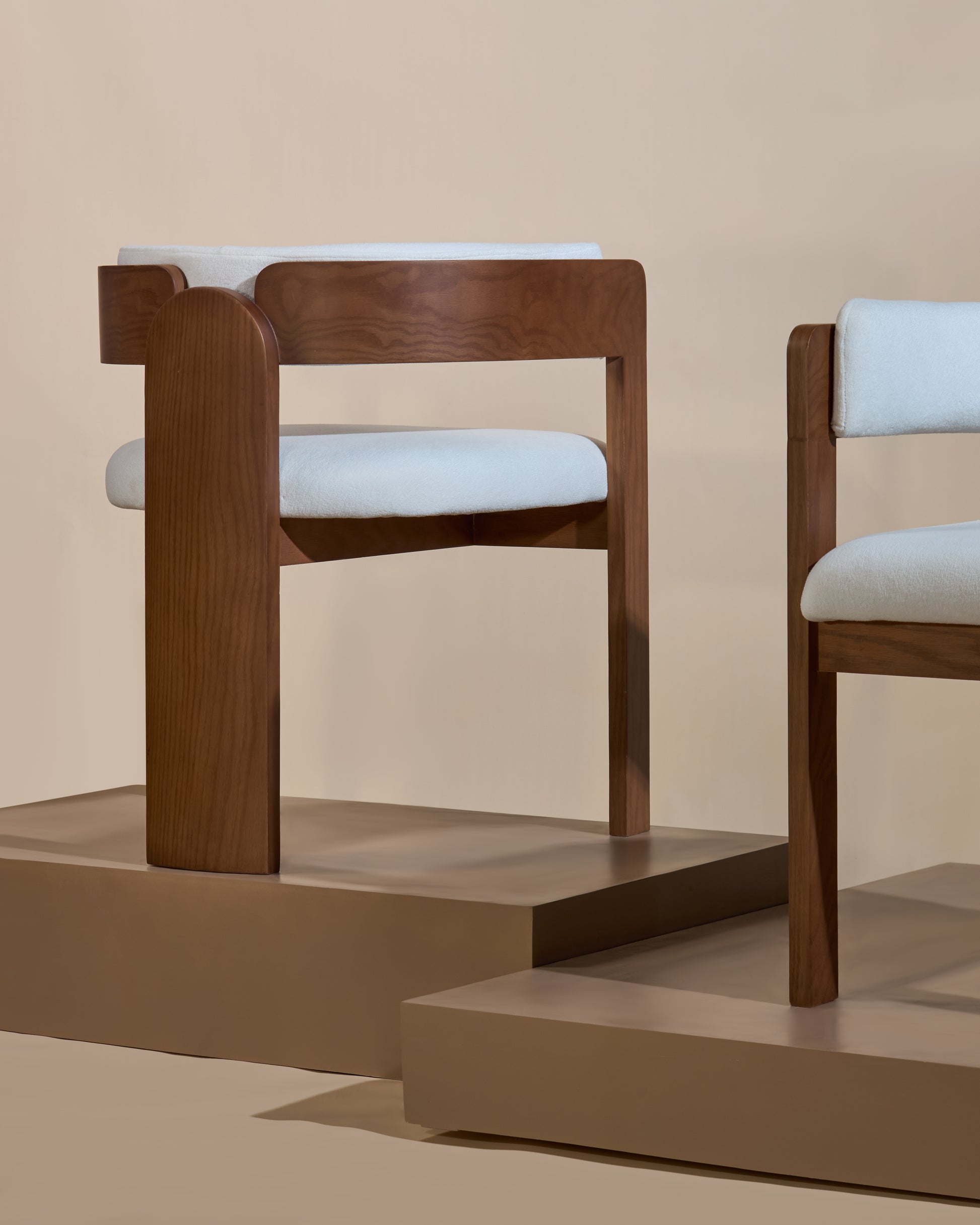 De Gezira eetkamerstoel heeft een luchtig, open ontwerp dat perfect in balans is met de robuuste uitstraling van het houten frame. De brede rugleuning en diepe zit maken deze stoel bijzonder comfortabel zonder afbreuk te doen aan het strakke silhouet.