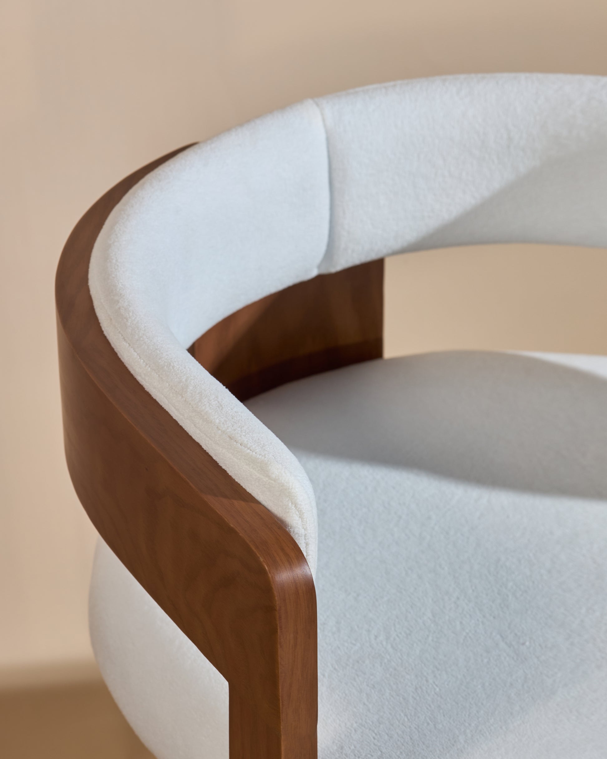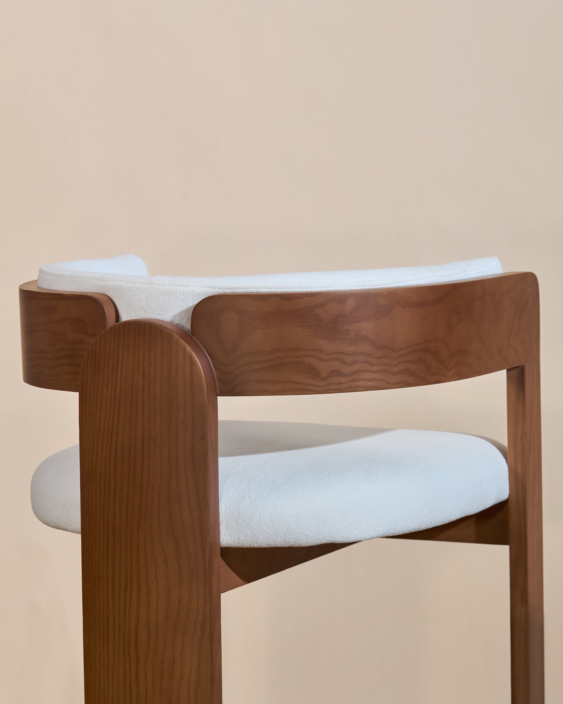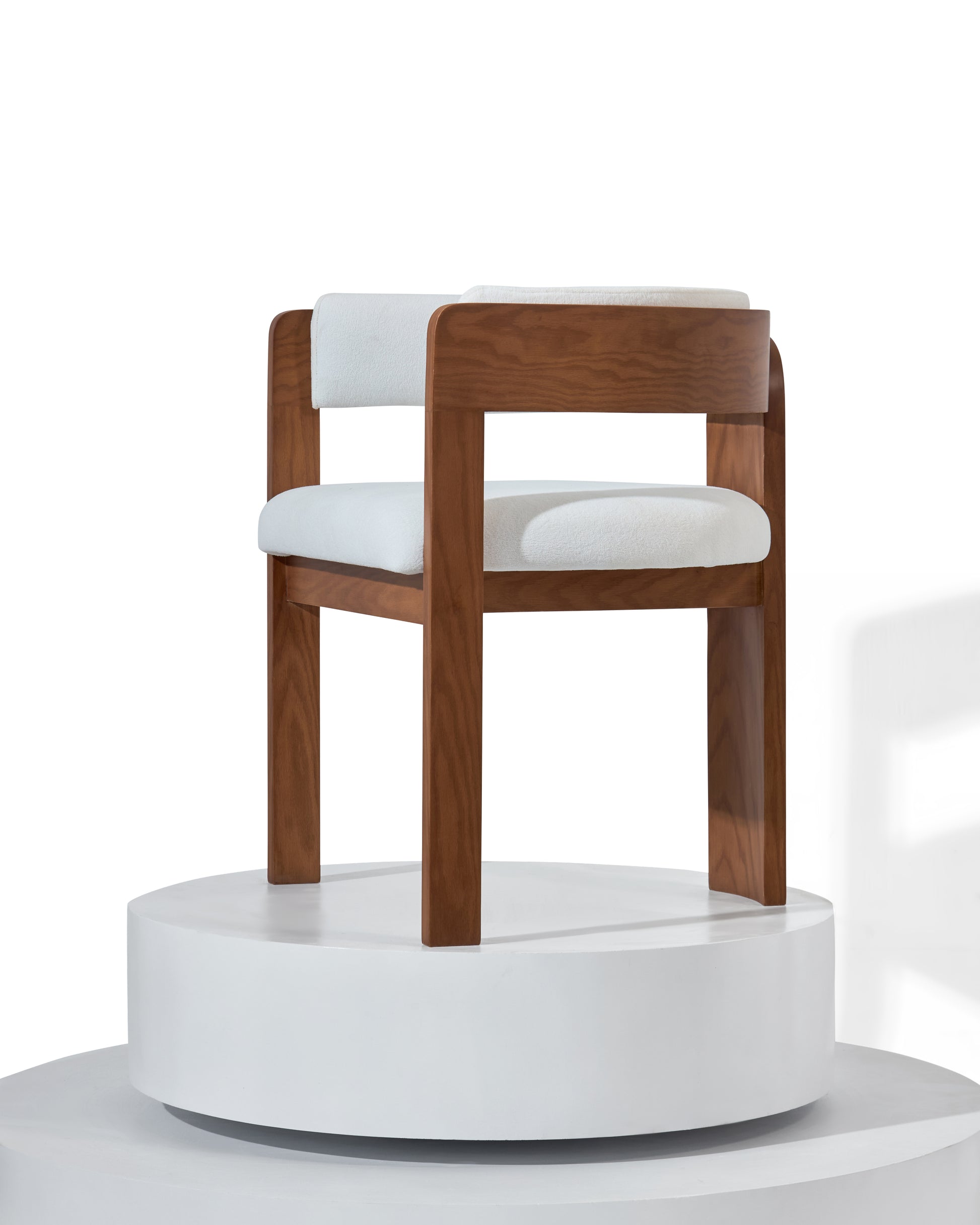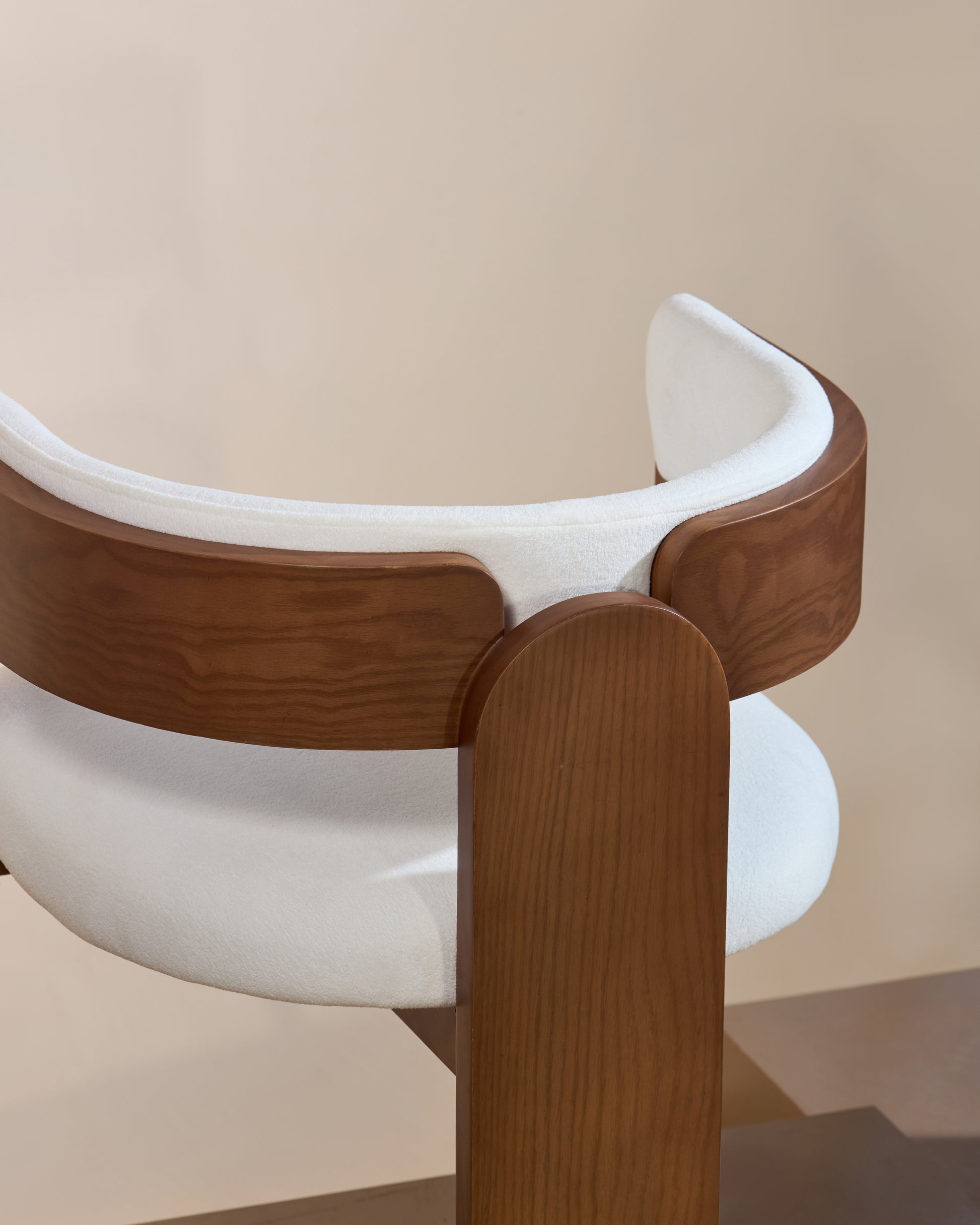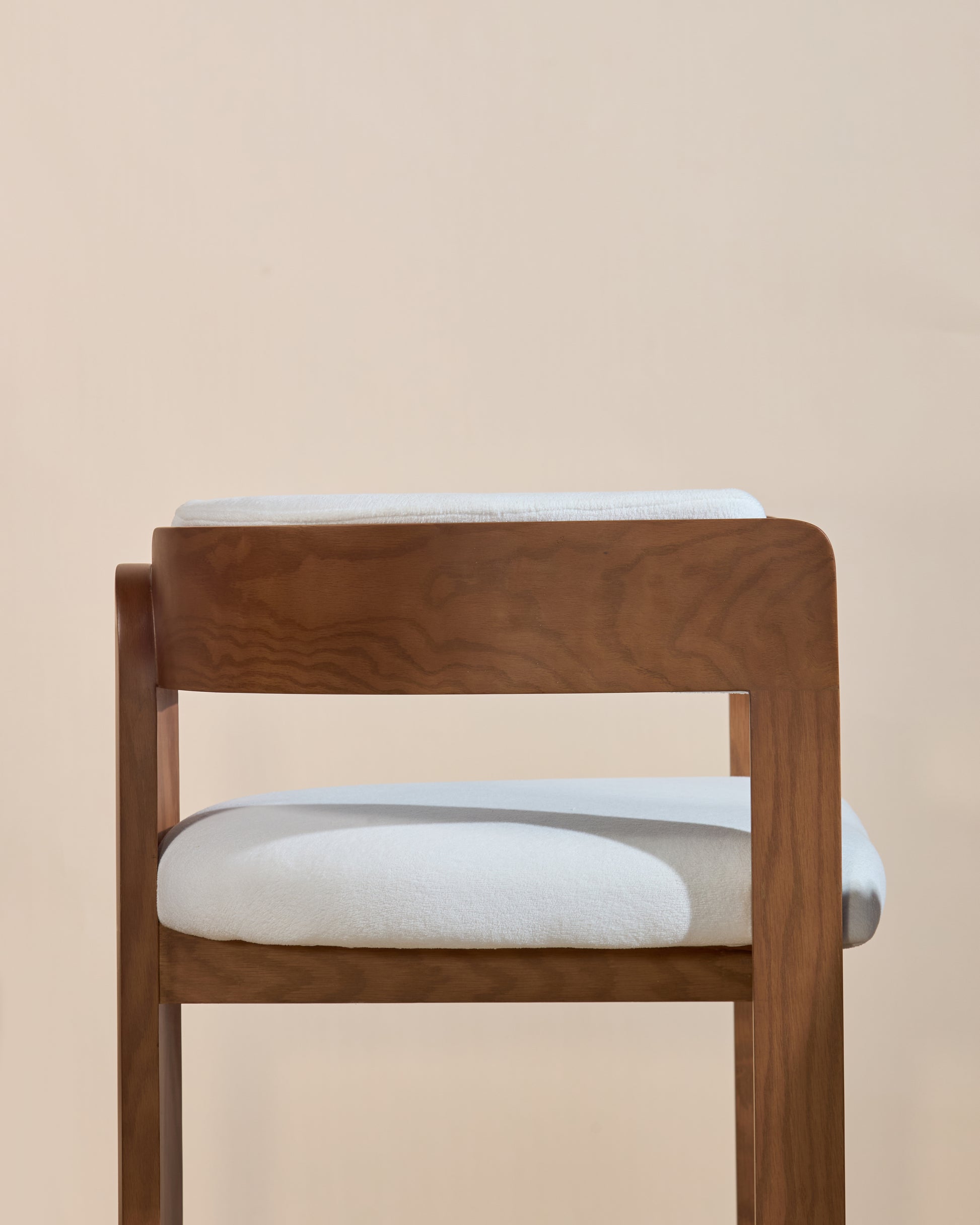 De Gezira eetkamerstoel heeft een luchtig, open ontwerp dat perfect in balans is met de robuuste uitstraling van het houten frame. De brede rugleuning en diepe zit maken deze stoel bijzonder comfortabel zonder afbreuk te doen aan het strakke silhouet.