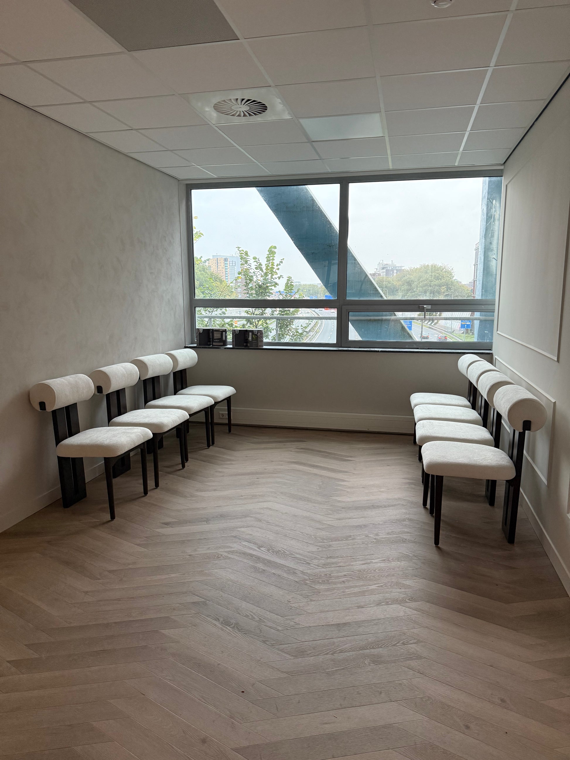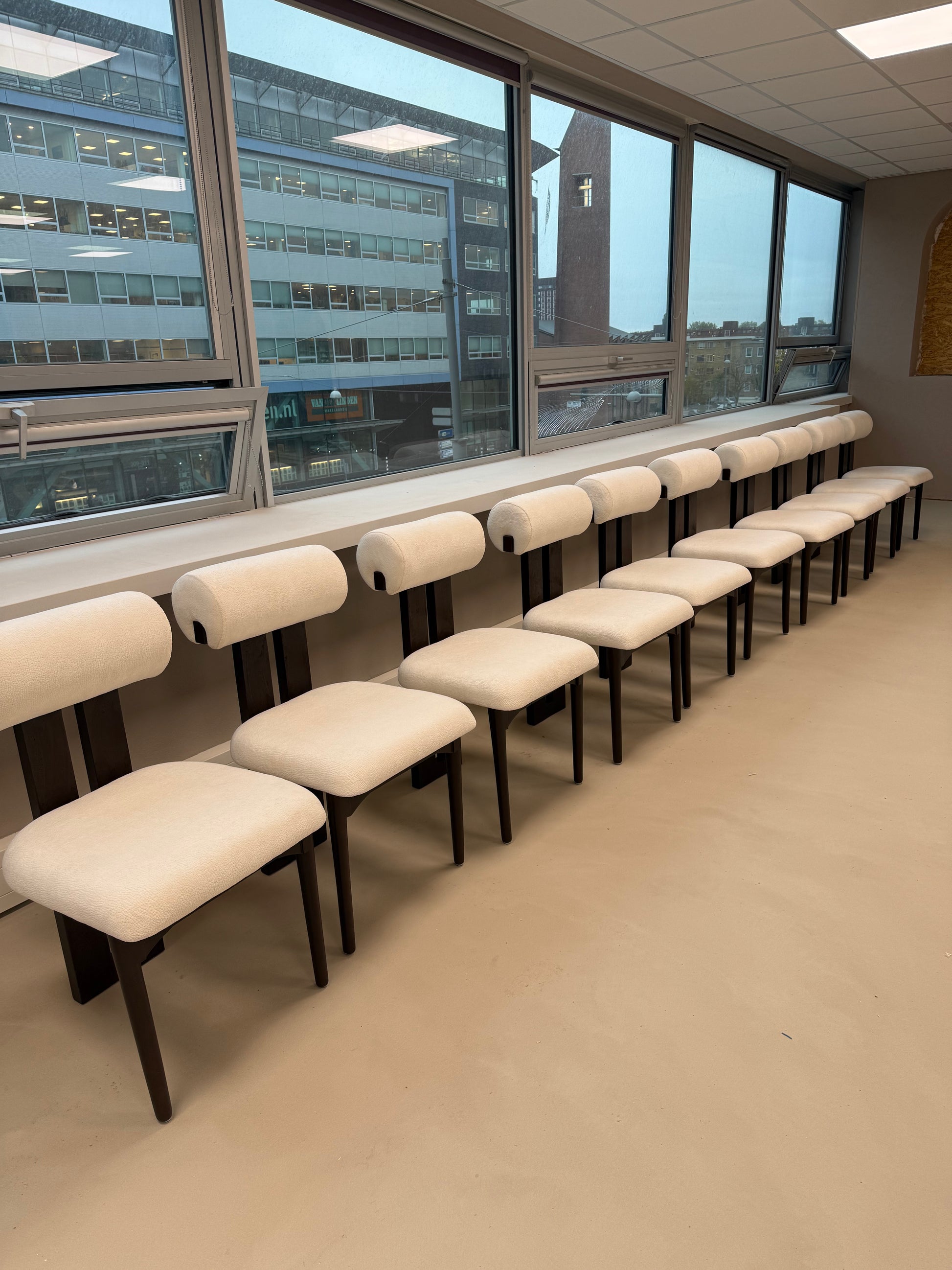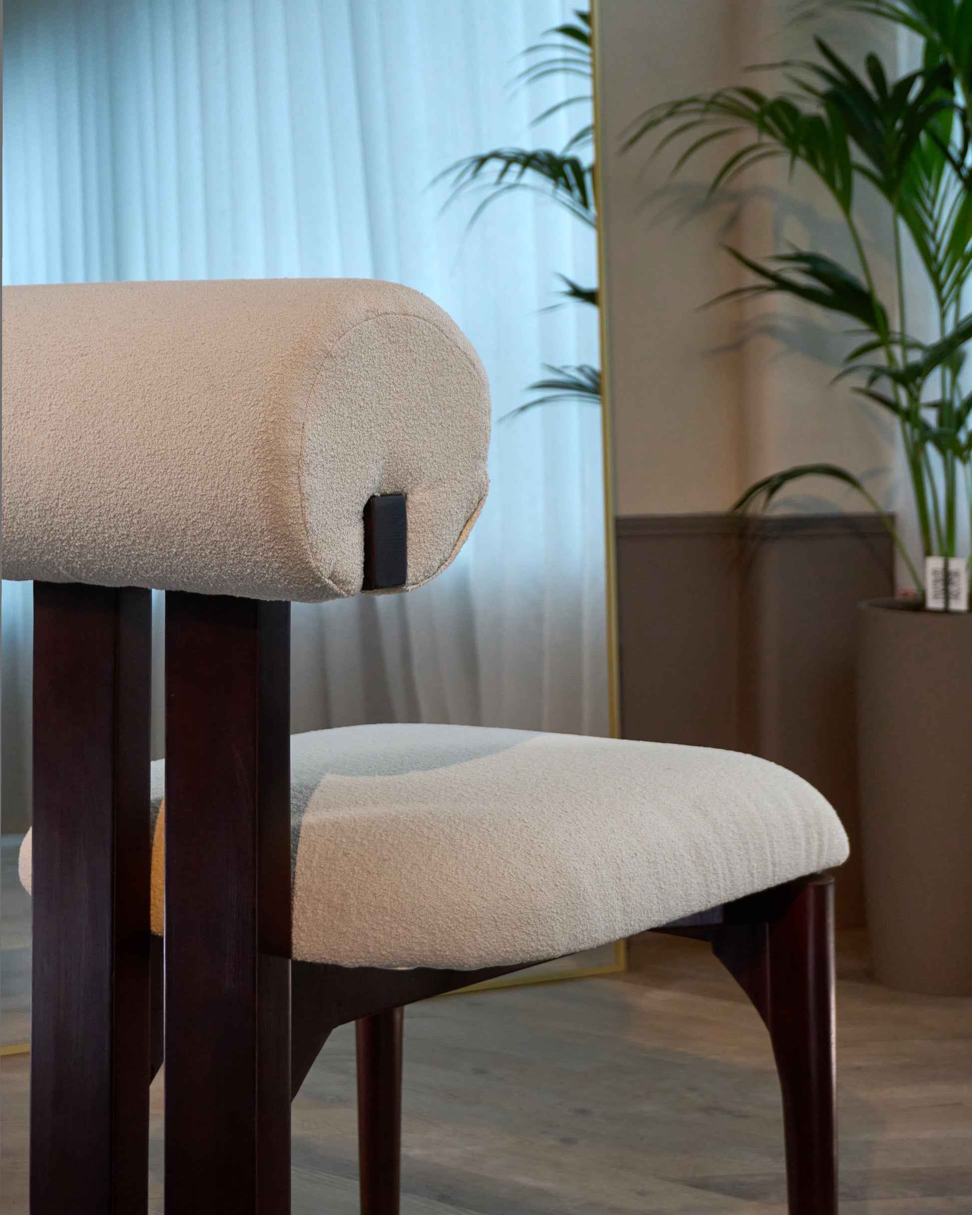 De Haru eetkamerstoel valt op door zijn sculpturale vorm. De afgeronde rugleuning rust op een verticale houten drager en biedt stevige ondersteuning, zonder dat het ontwerp zwaar oogt.