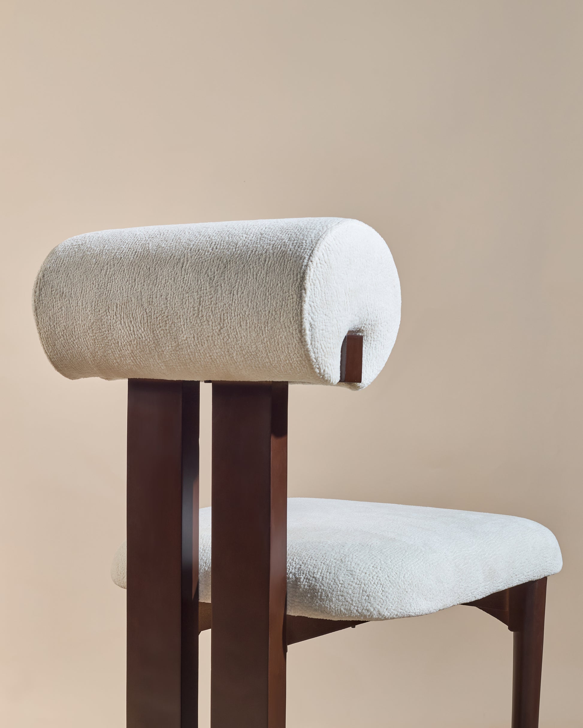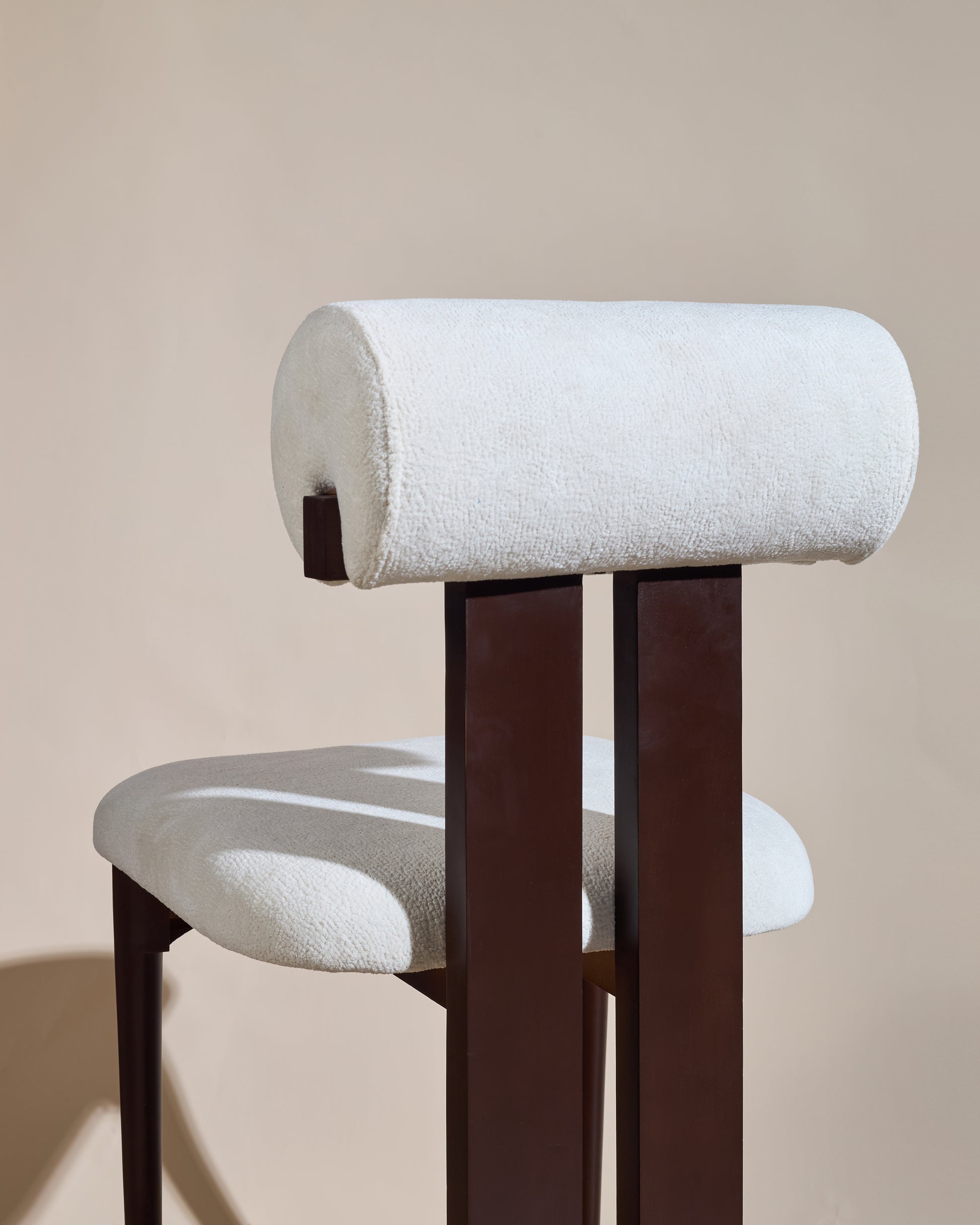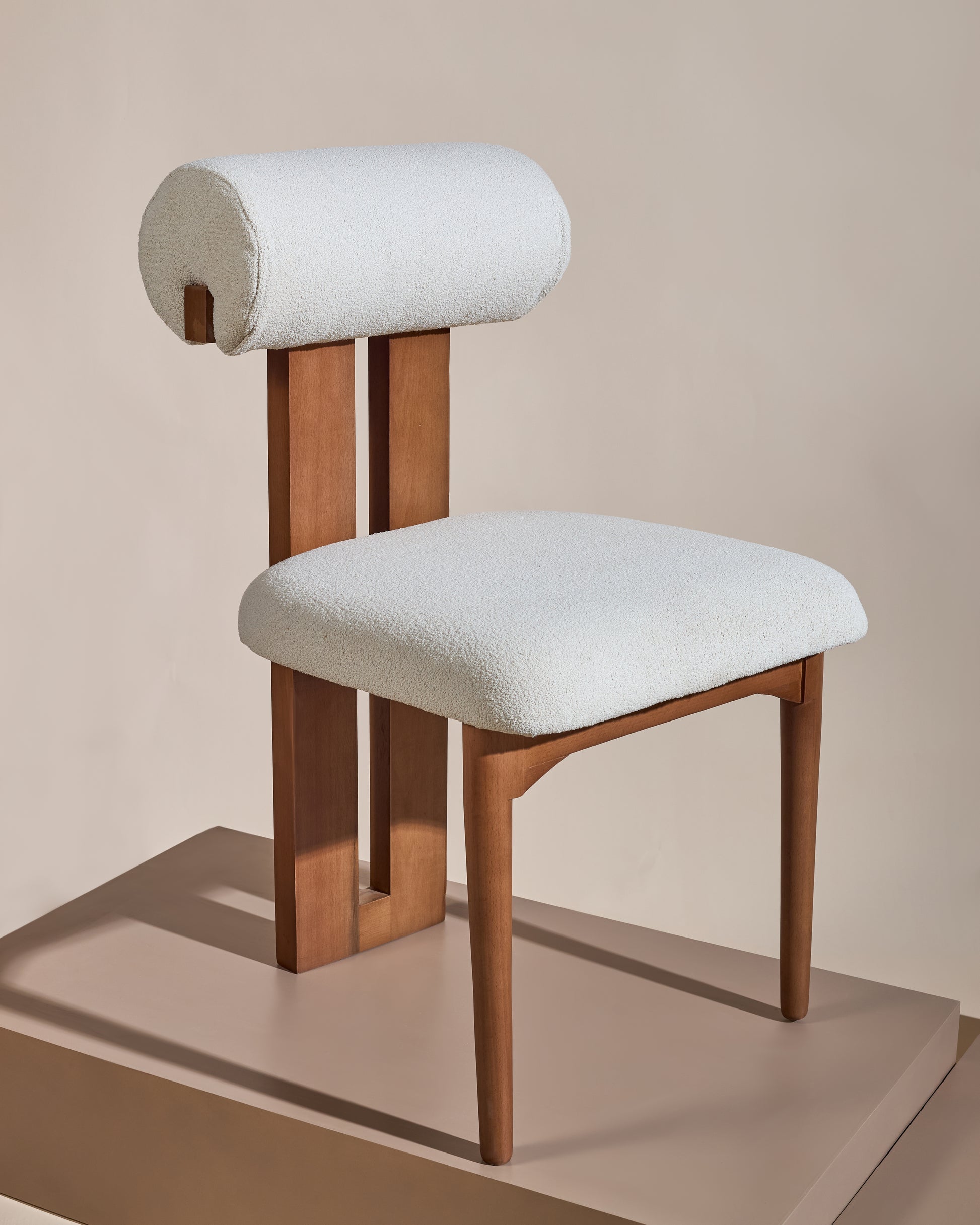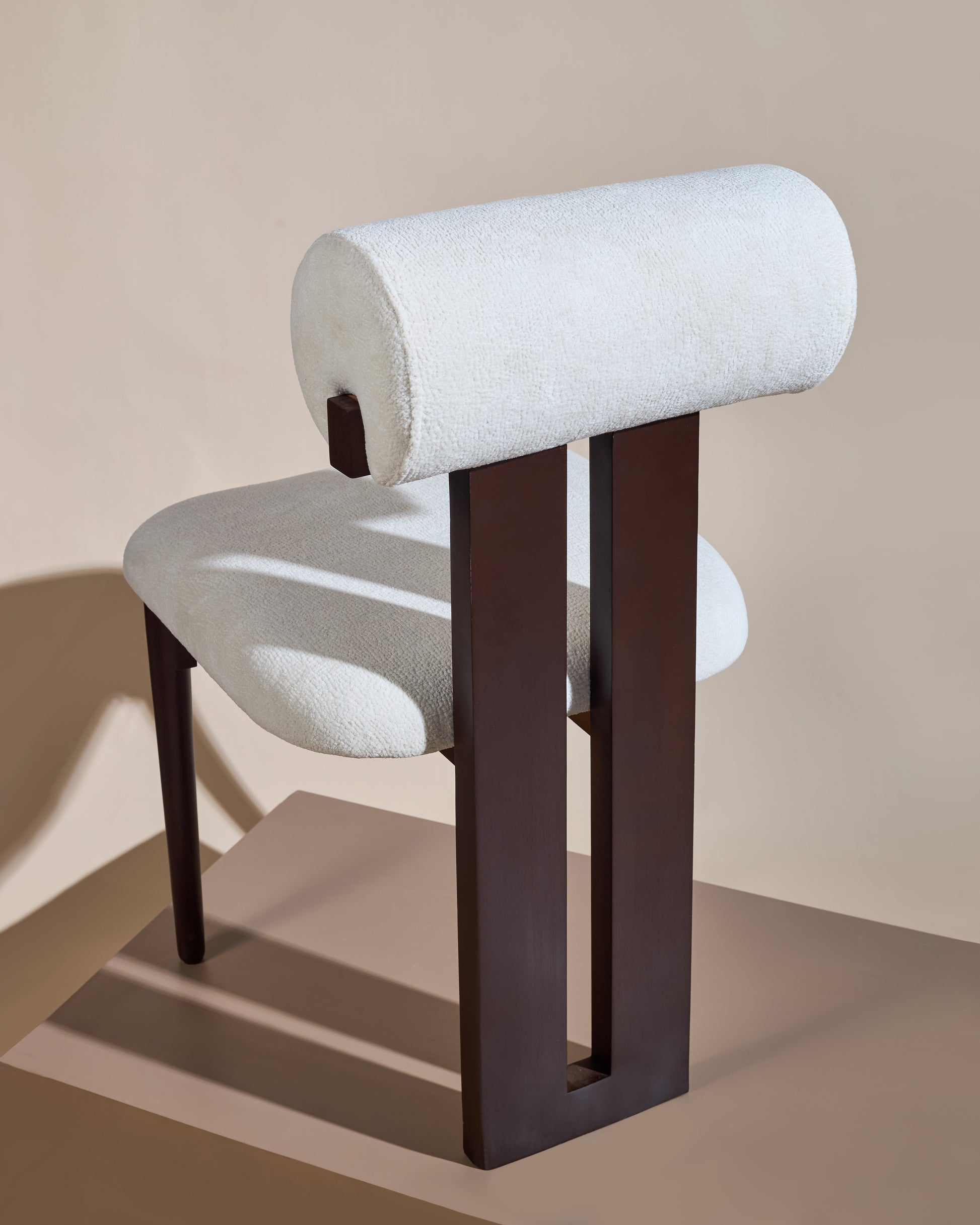 De Haru eetkamerstoel valt op door zijn sculpturale vorm. De afgeronde rugleuning rust op een verticale houten drager en biedt stevige ondersteuning, zonder dat het ontwerp zwaar oogt.