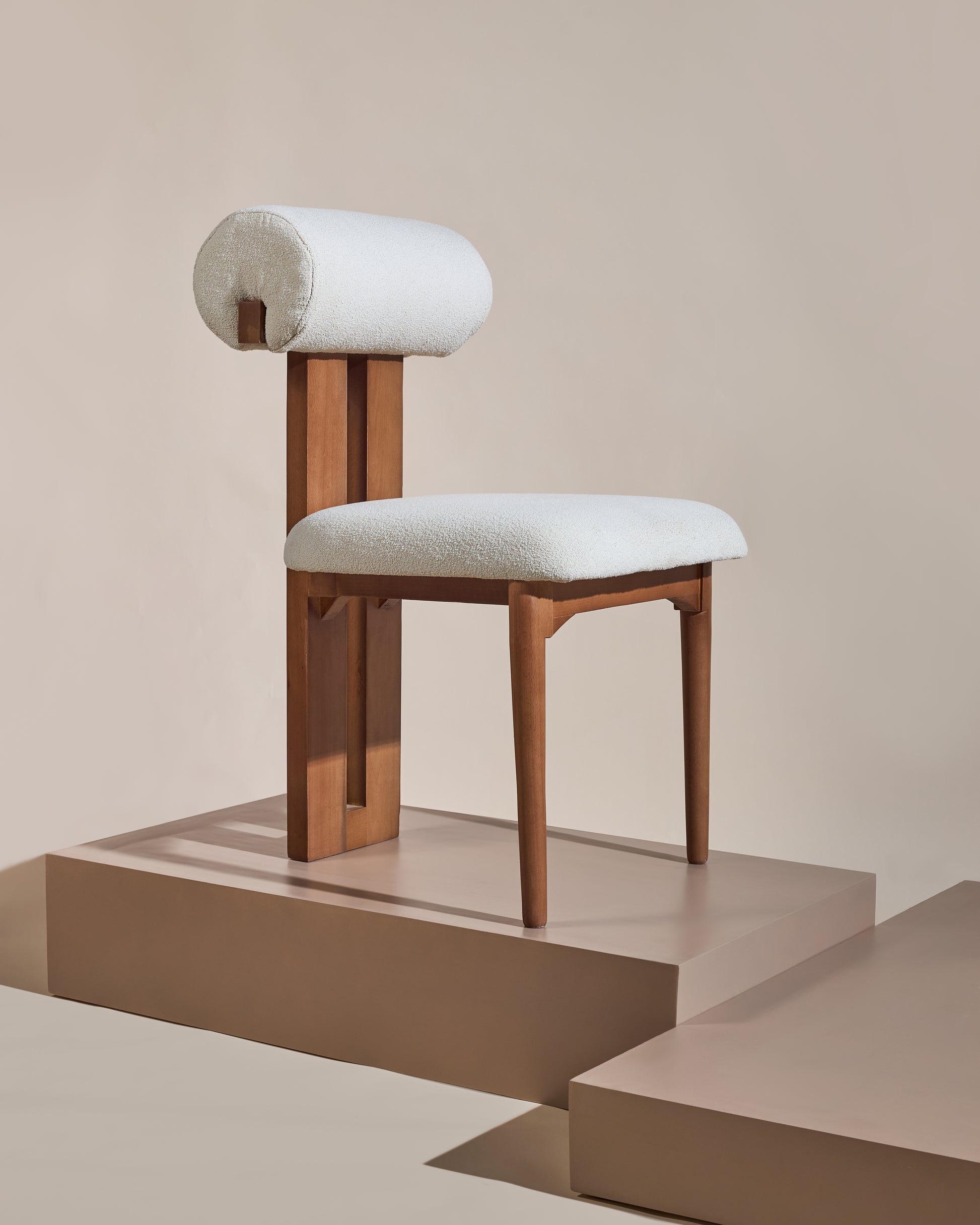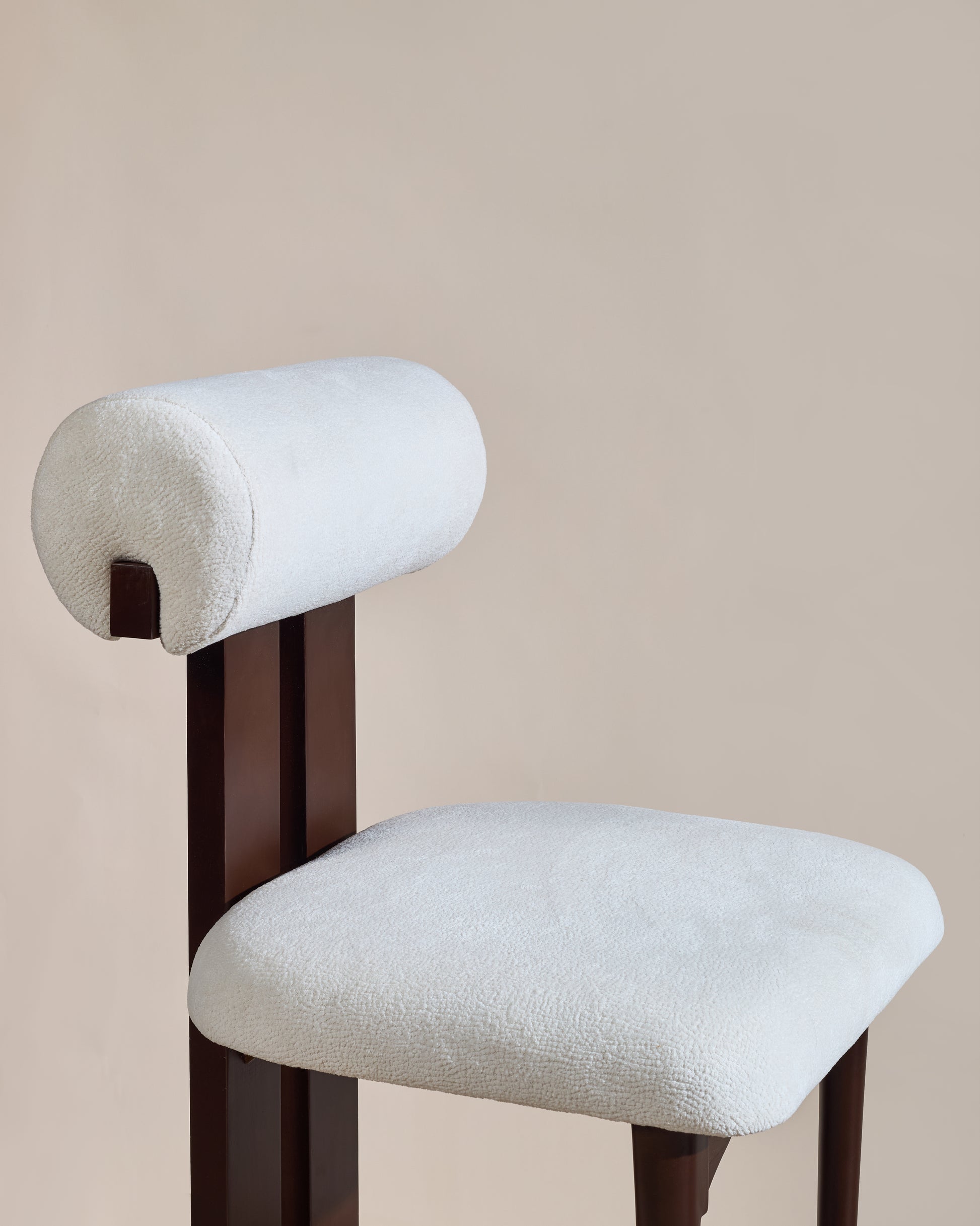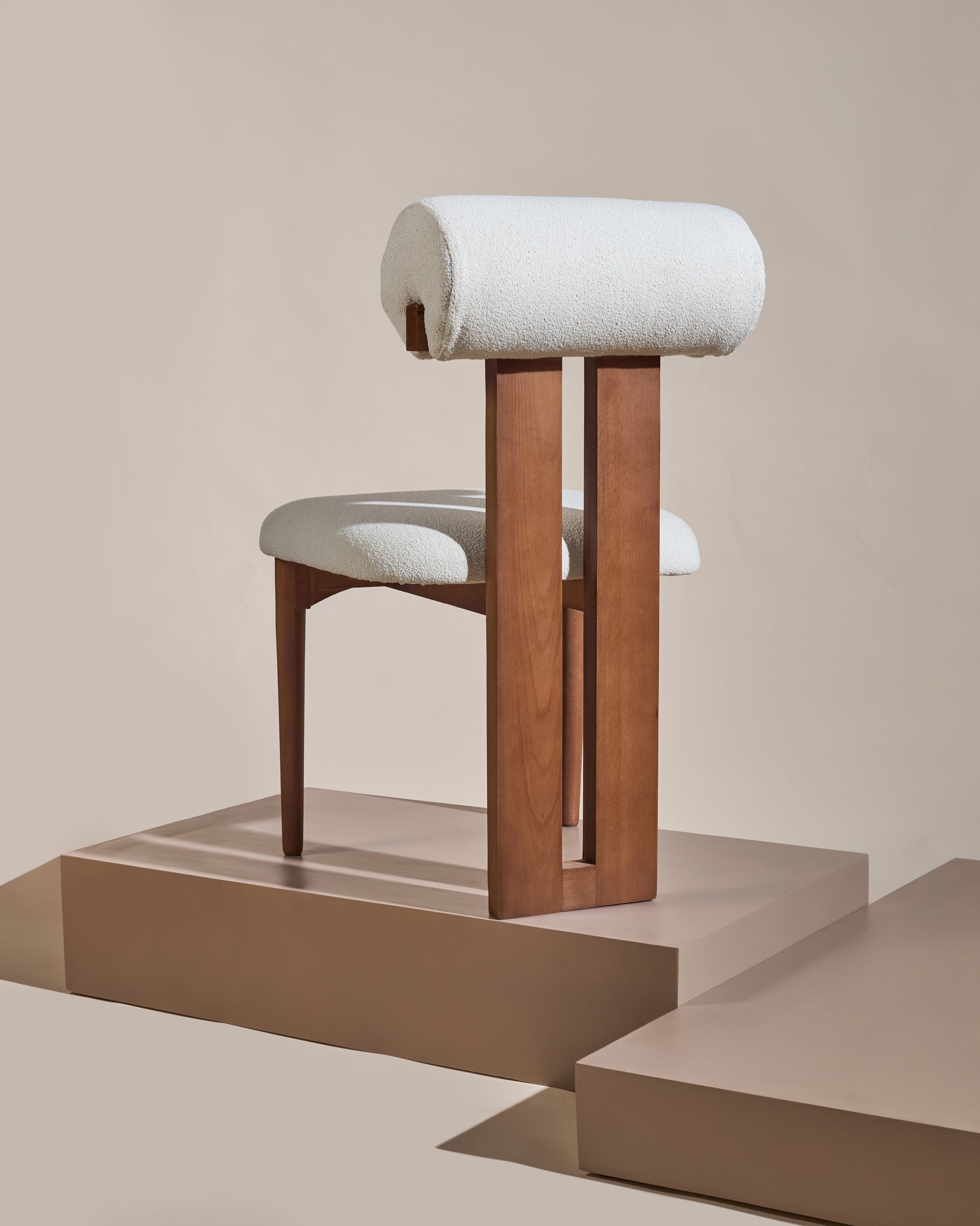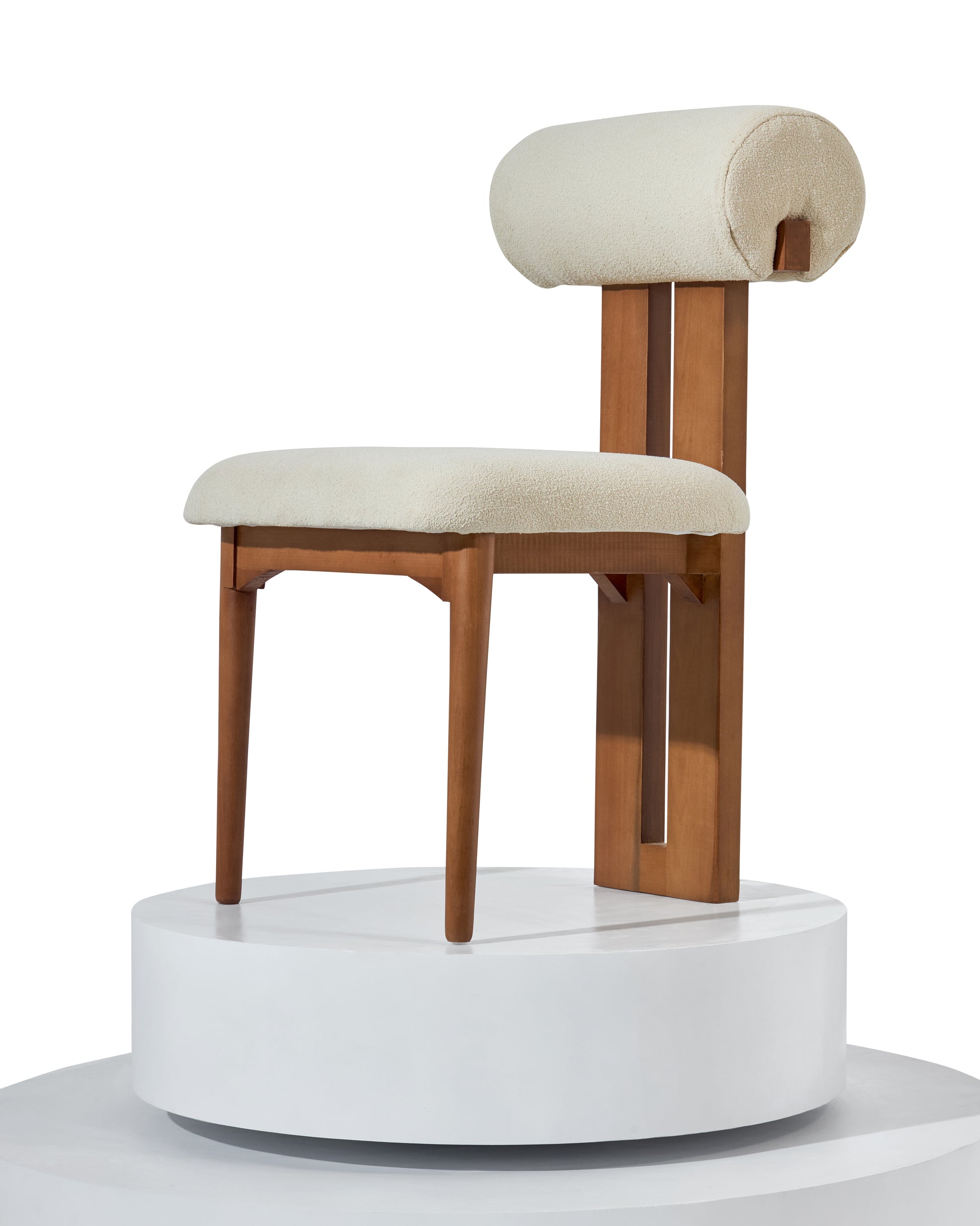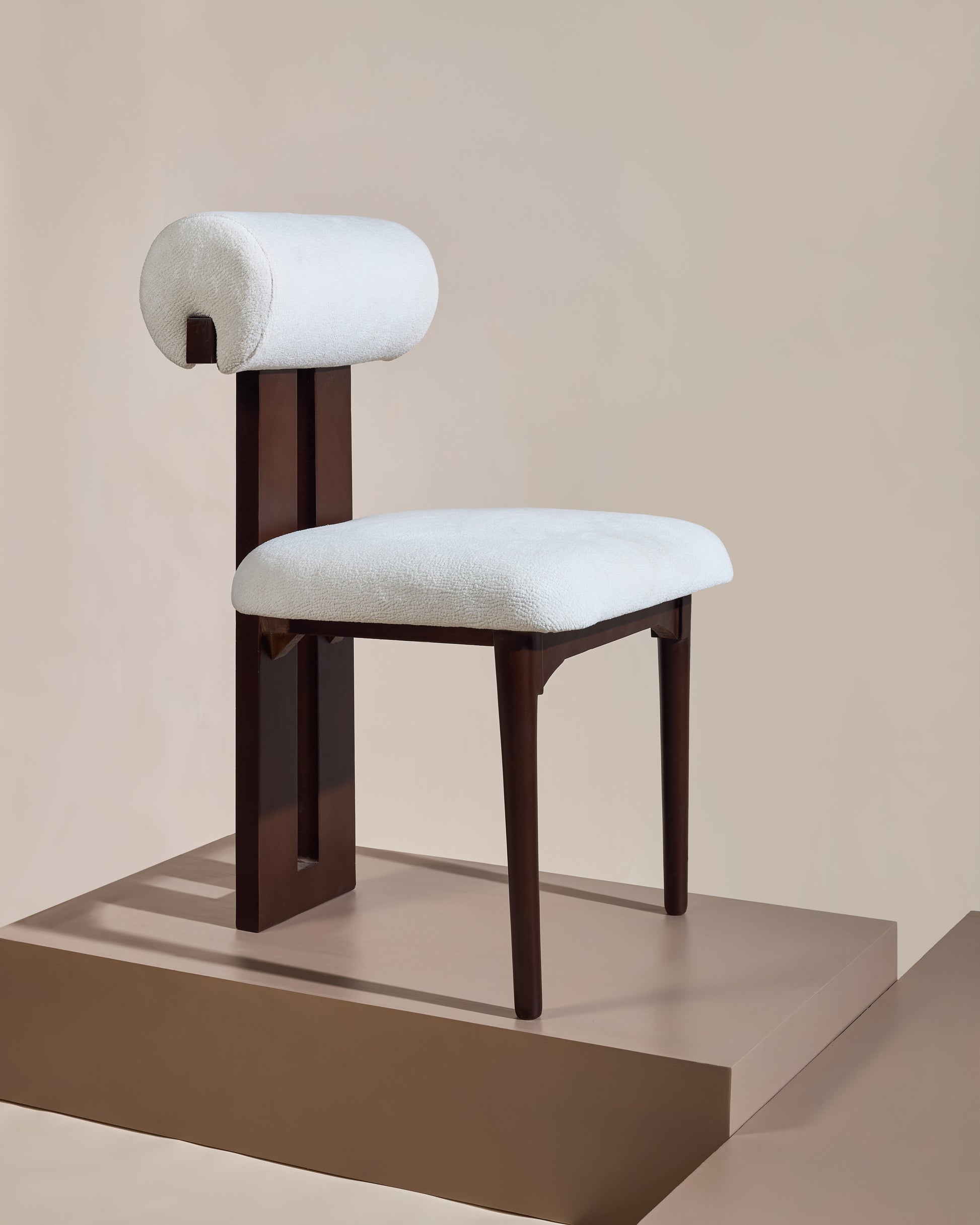 De Haru eetkamerstoel valt op door zijn sculpturale vorm. De afgeronde rugleuning rust op een verticale houten drager en biedt stevige ondersteuning, zonder dat het ontwerp zwaar oogt.