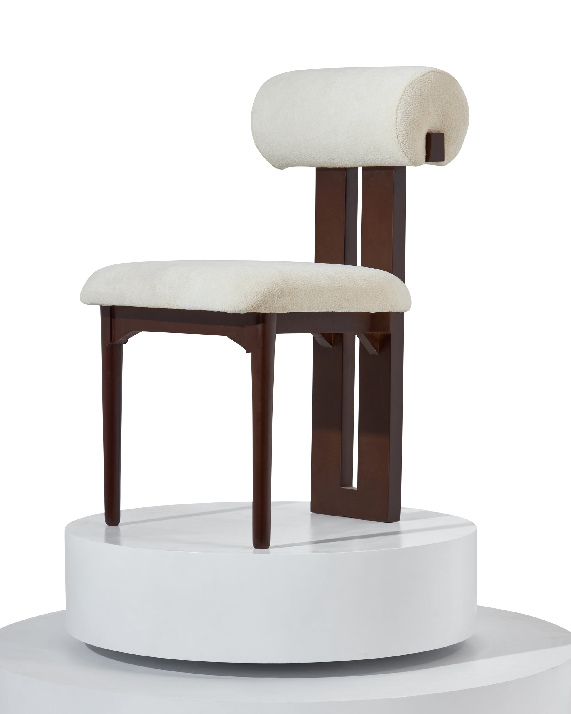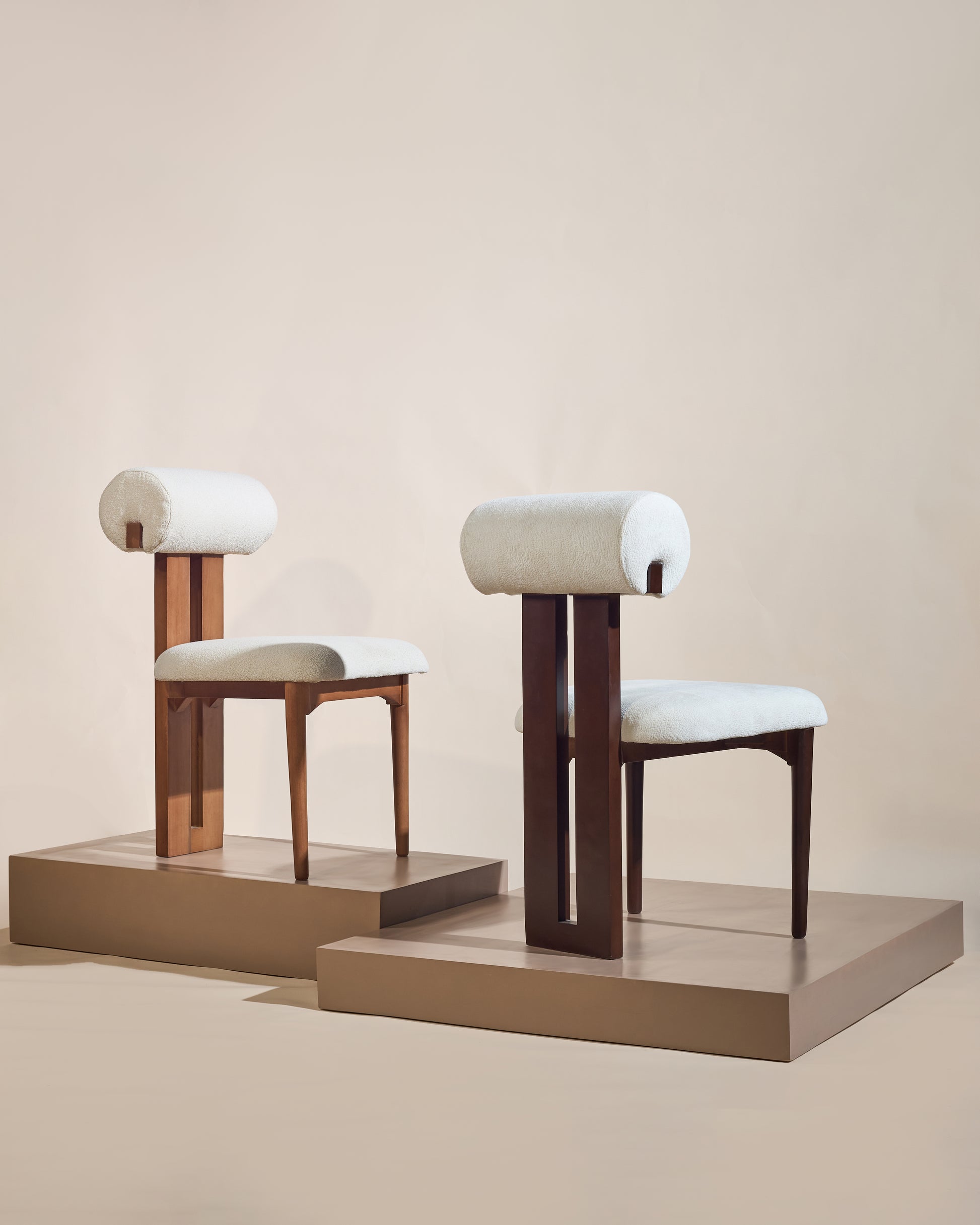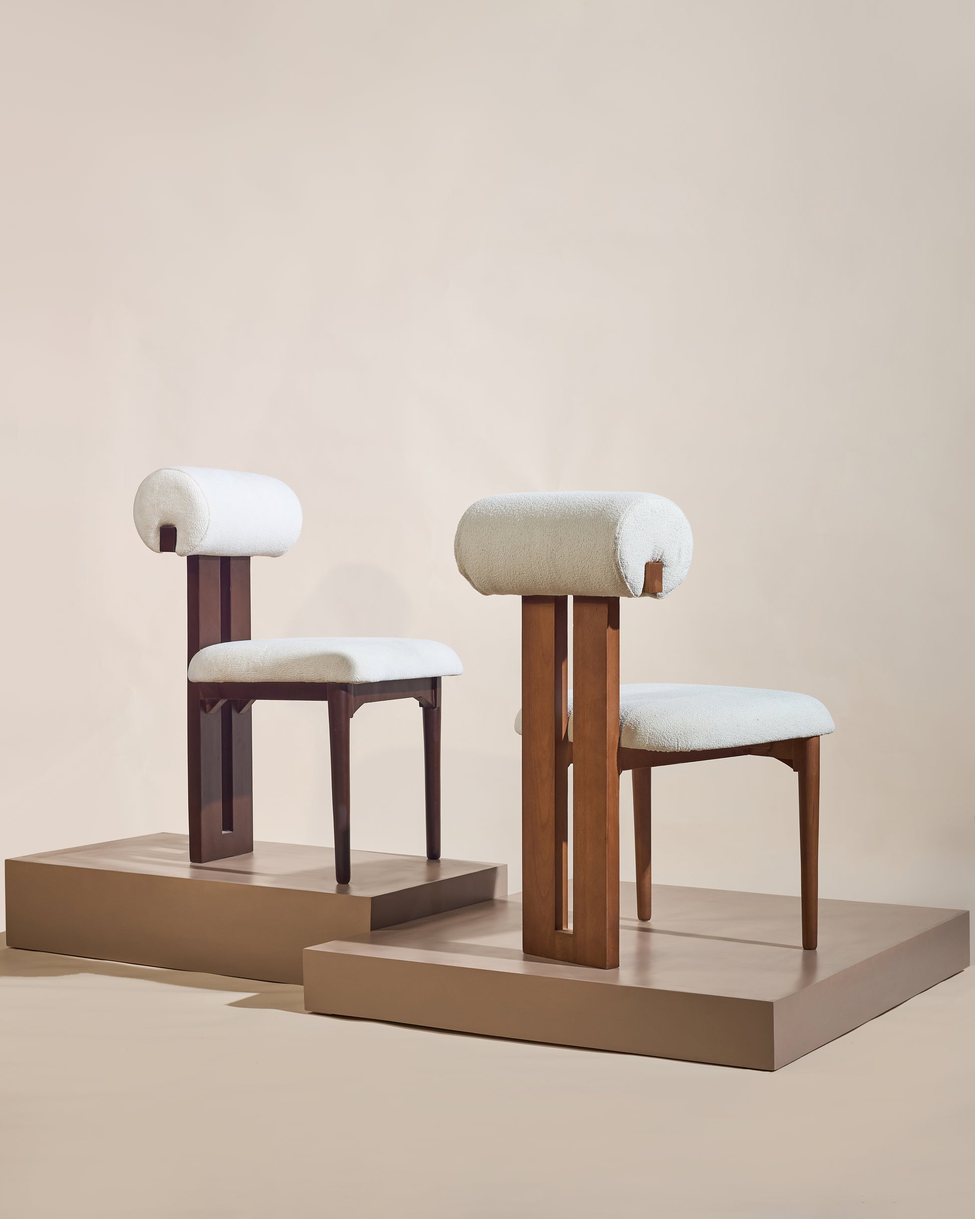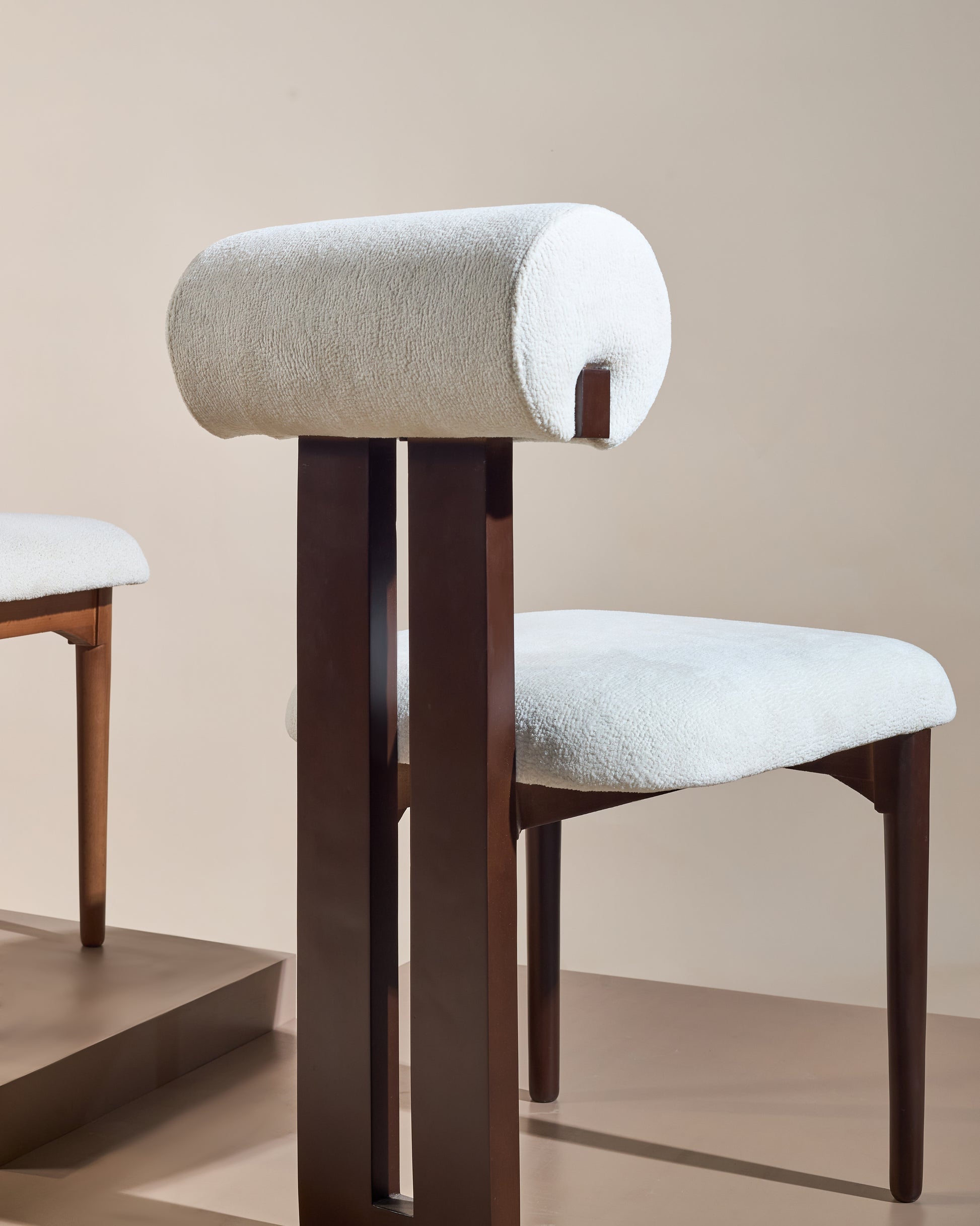 De Haru eetkamerstoel valt op door zijn sculpturale vorm. De afgeronde rugleuning rust op een verticale houten drager en biedt stevige ondersteuning, zonder dat het ontwerp zwaar oogt.