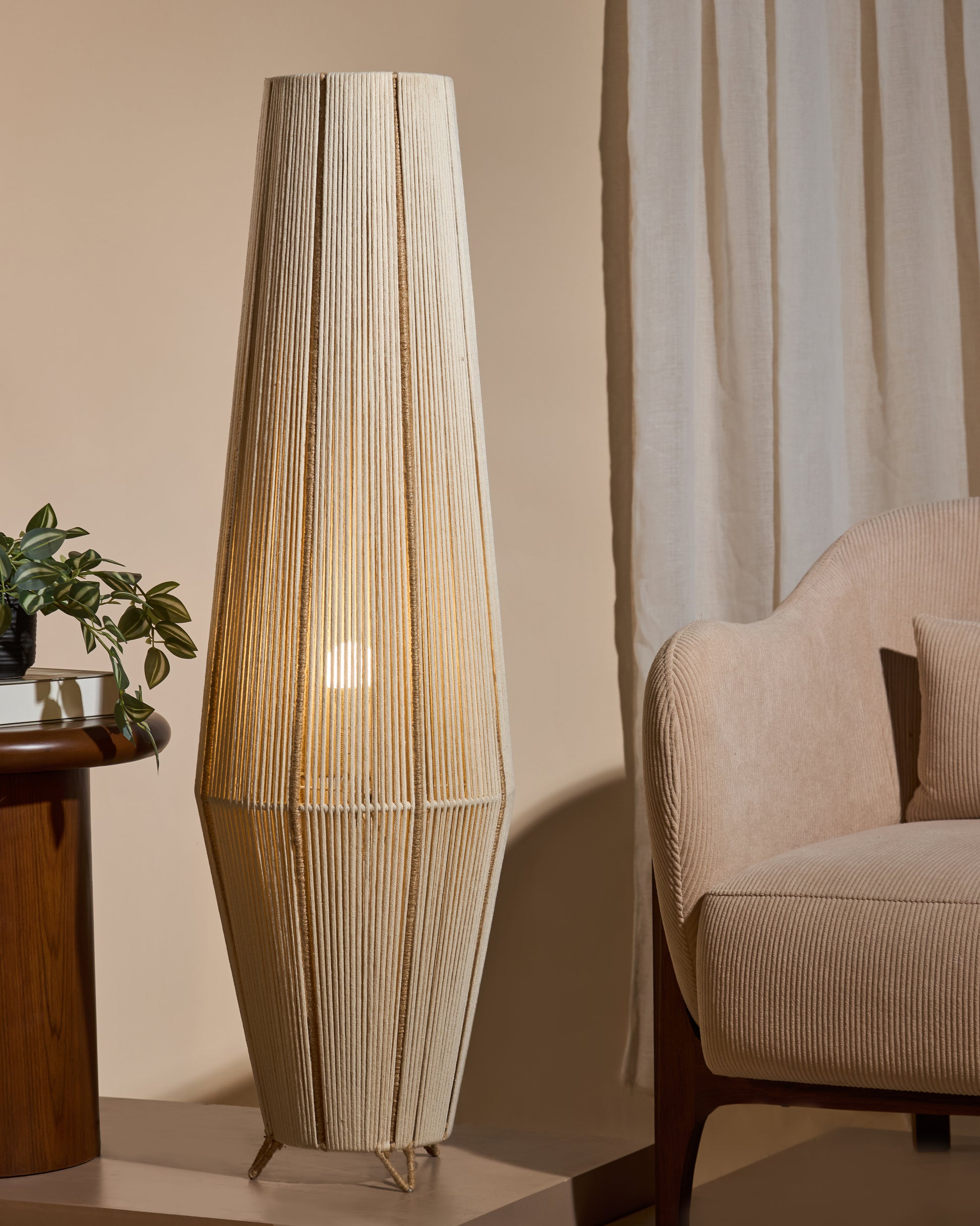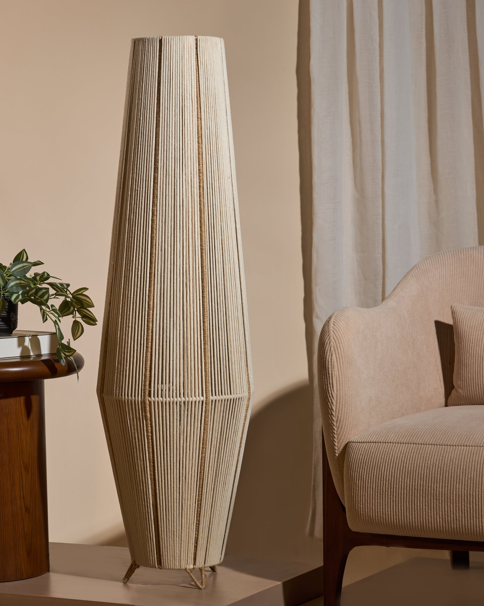 Een vloerlamp met karakter. Deze handgemaakte blikvanger van 120 cm heeft een elegante, taps toelopende vorm die zorgt voor een subtiel spel van licht en schaduw. De strak gespannen draden in zachte, neutrale tinten geven de lamp een moderne, ambachtelijke uitstraling. Perfect voor een warme en stijlvolle sfeer in huis.