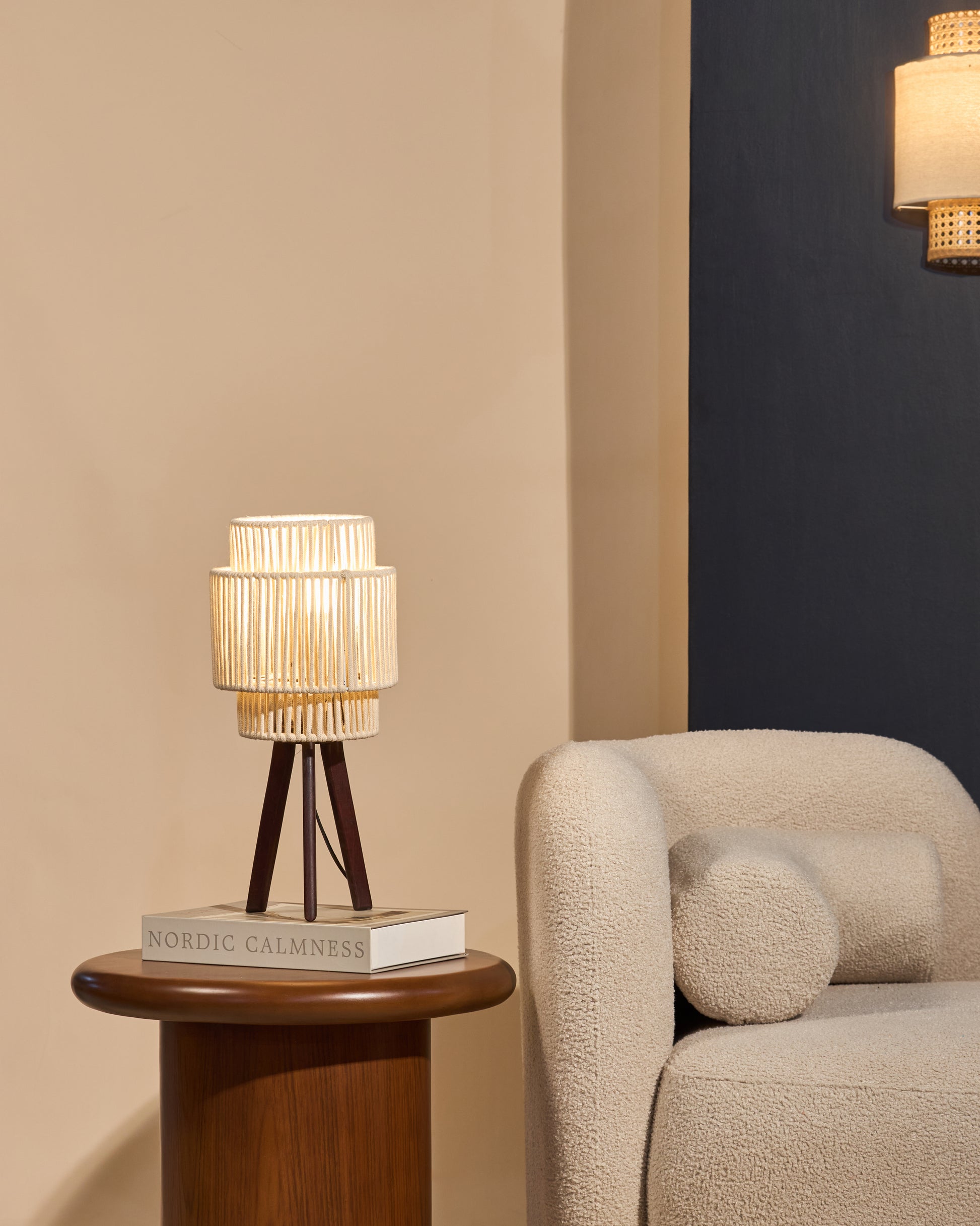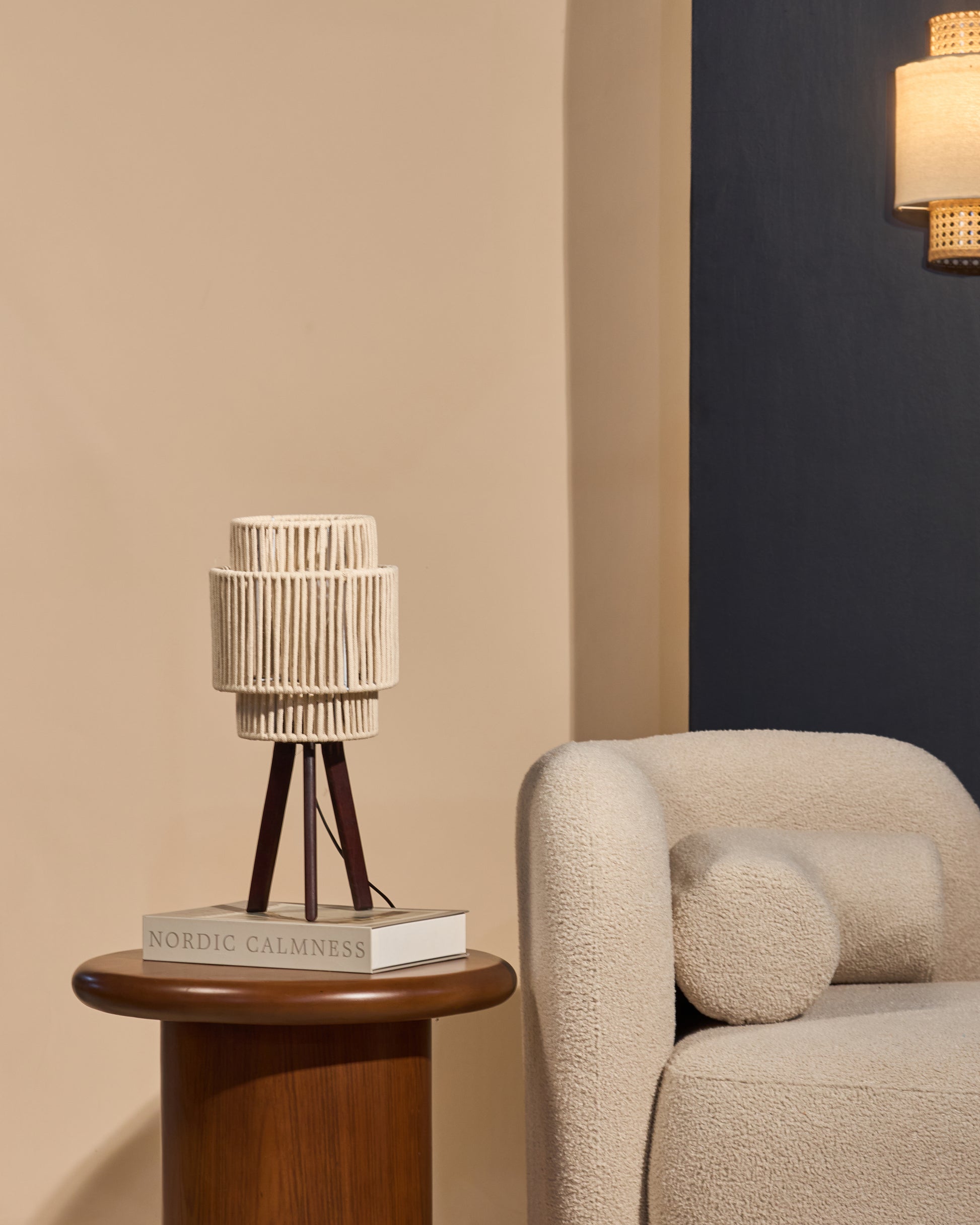Deze speelse tafellamp combineert een warme uitstraling met een modern design. De lampenkap is met de hand gewikkeld in licht touw voor een zachte lichtval, rustend op drie stevige houten poten. Een subtiel statementstuk voor je nachtkastje of dressoir.