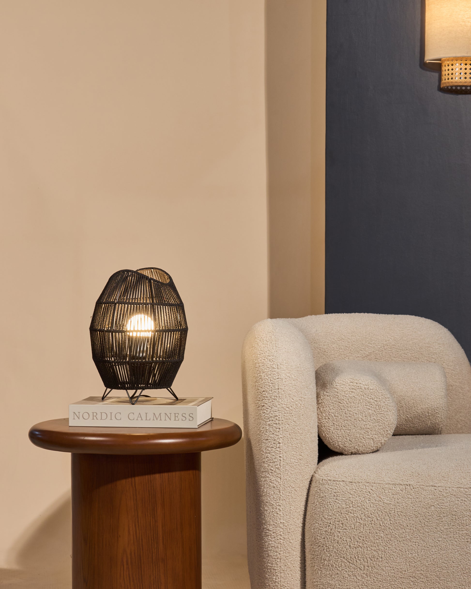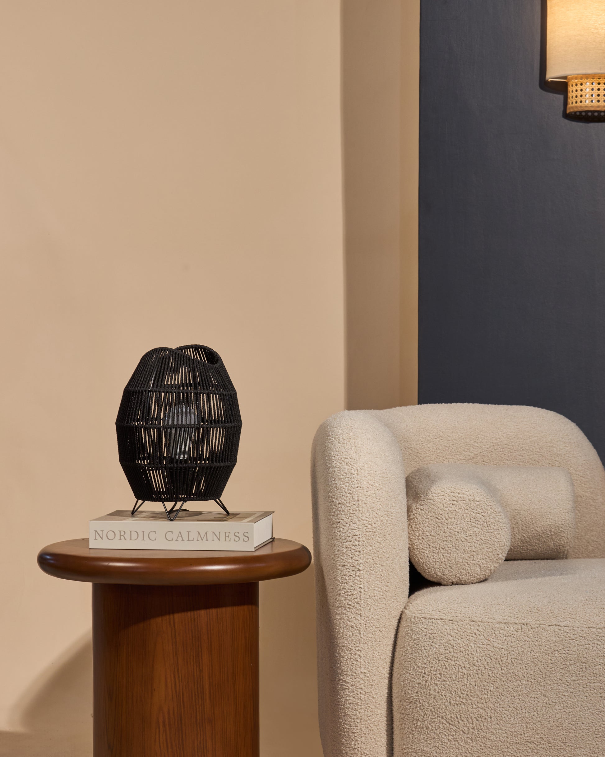 Deze handgemaakte tafellamp trekt de aandacht met zijn organische vorm en open structuur. De zwarte touwdraden vormen een speels lijnenspel rondom het licht, waardoor een warme en sfeervolle gloed ontstaat. Een stijlvol accent voor in de woonkamer, hal of slaapkamer.