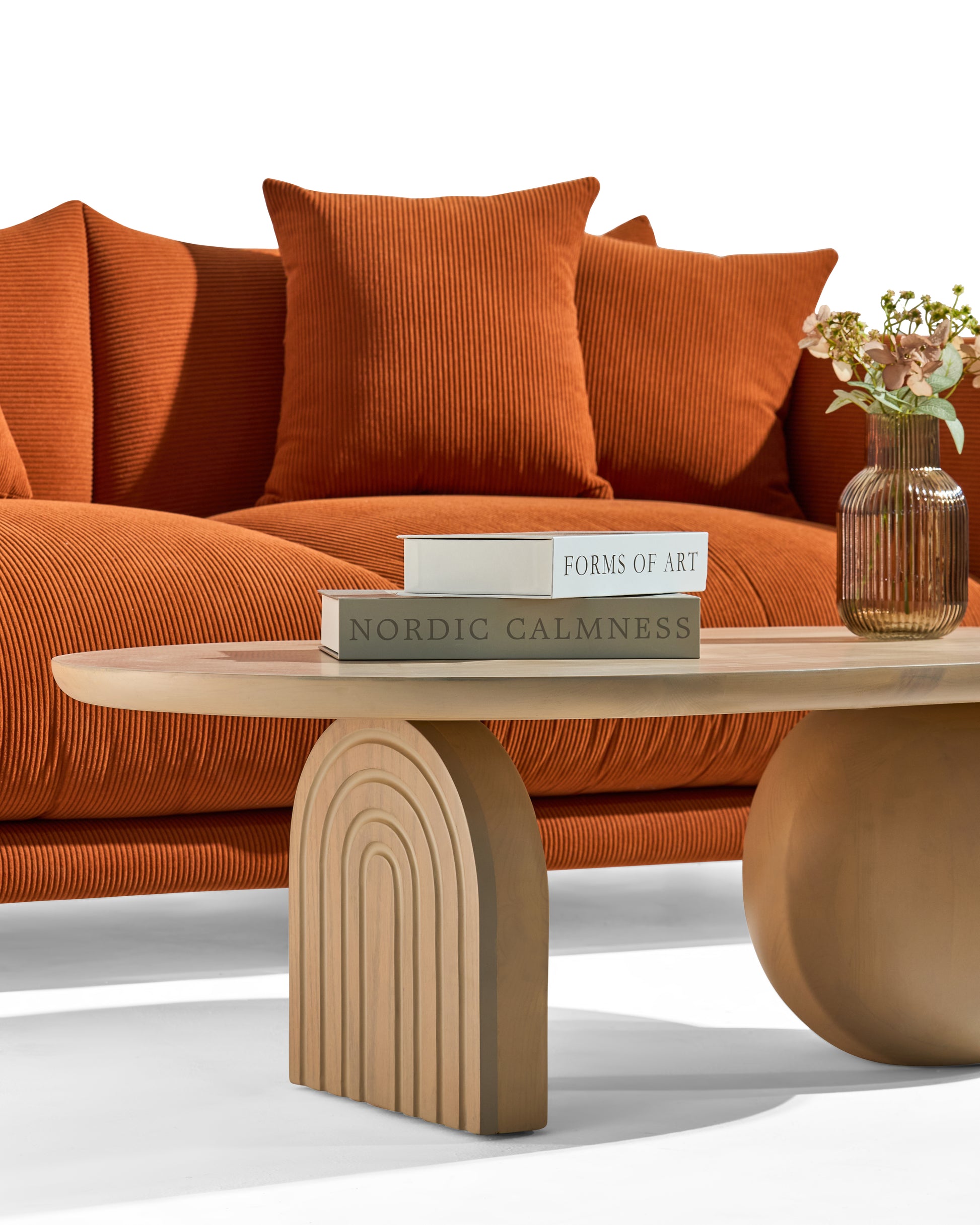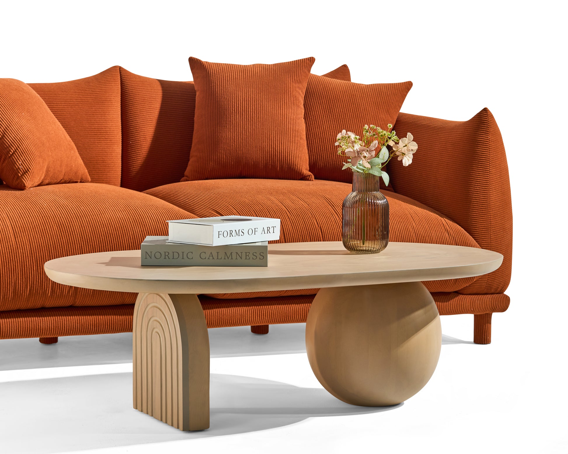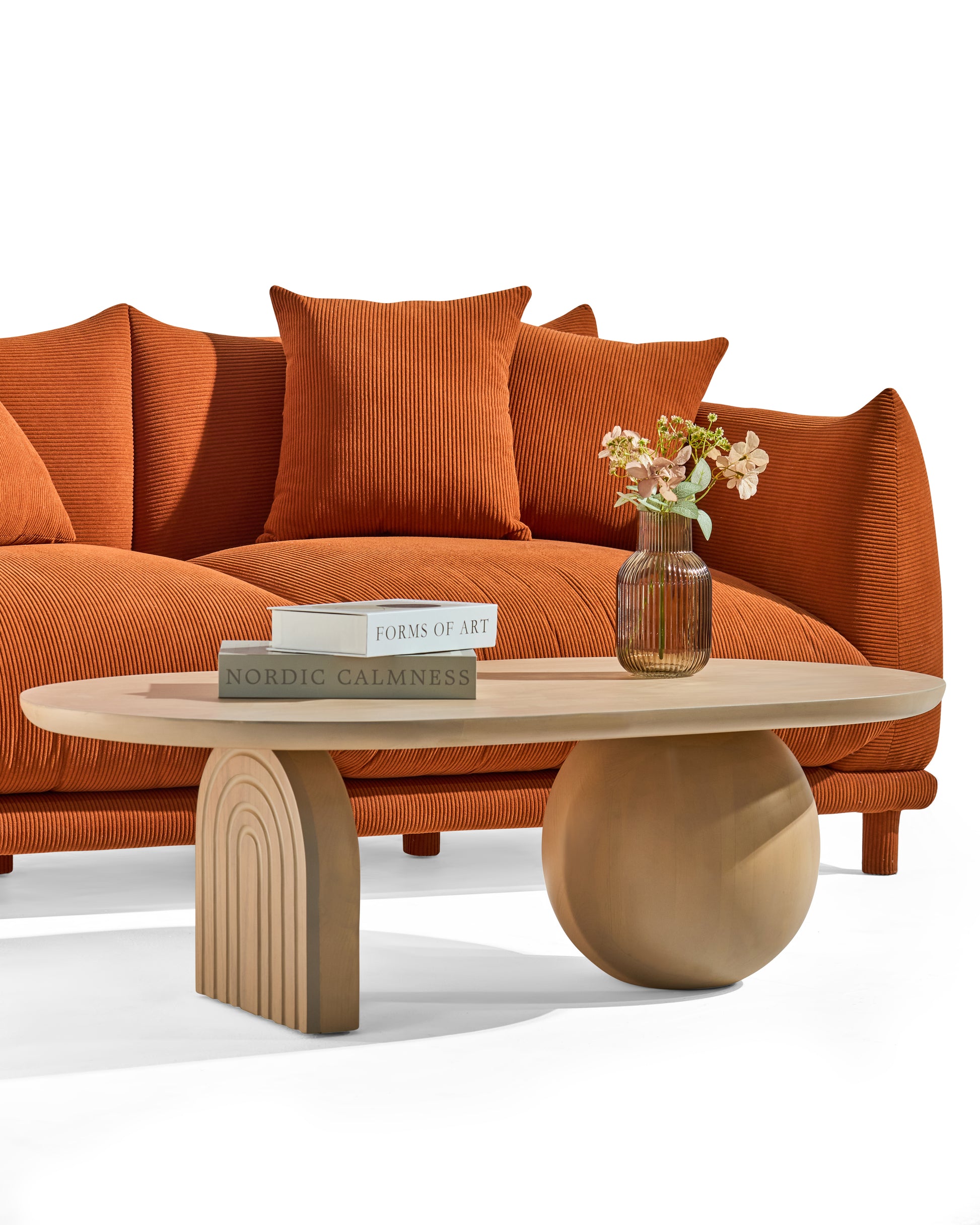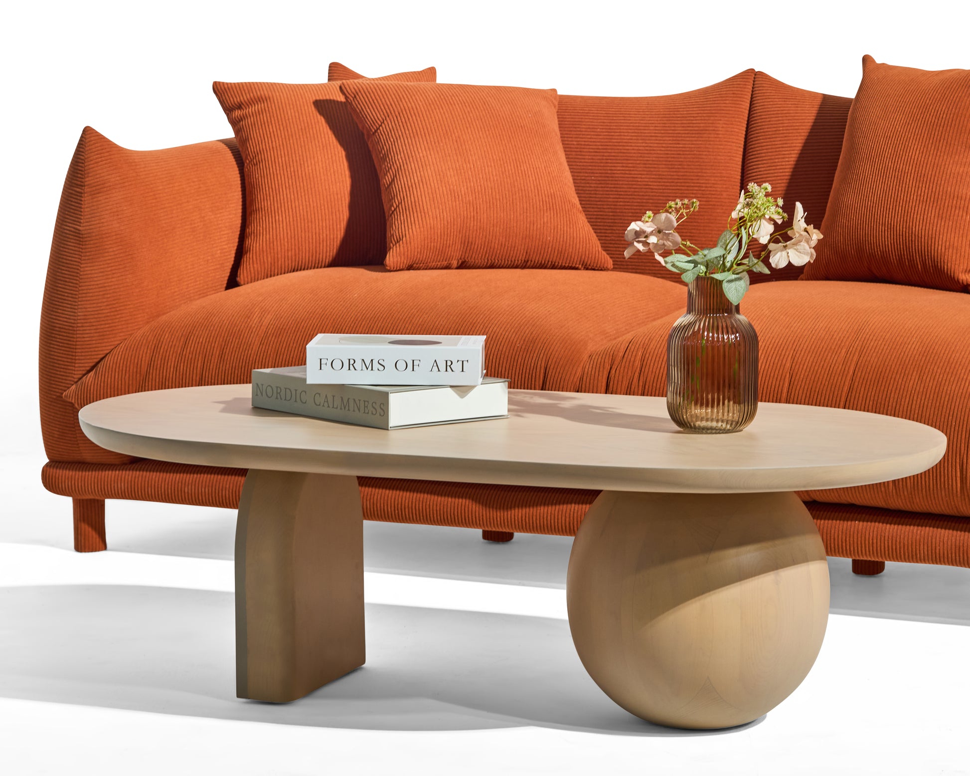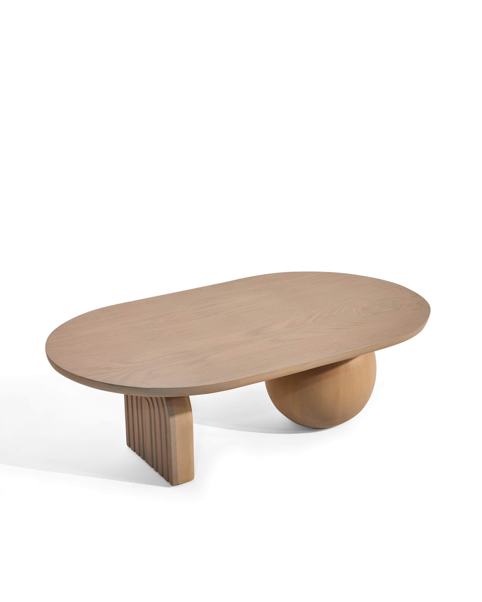 Een salontafel met een zachte uitstraling en speelse vormen. De combinatie van het ronde blad, de bolvormige poot en de gebogen houten steun geeft dit meubel een vriendelijk karakter. Ideaal om je zithoek warmte en originaliteit te geven.