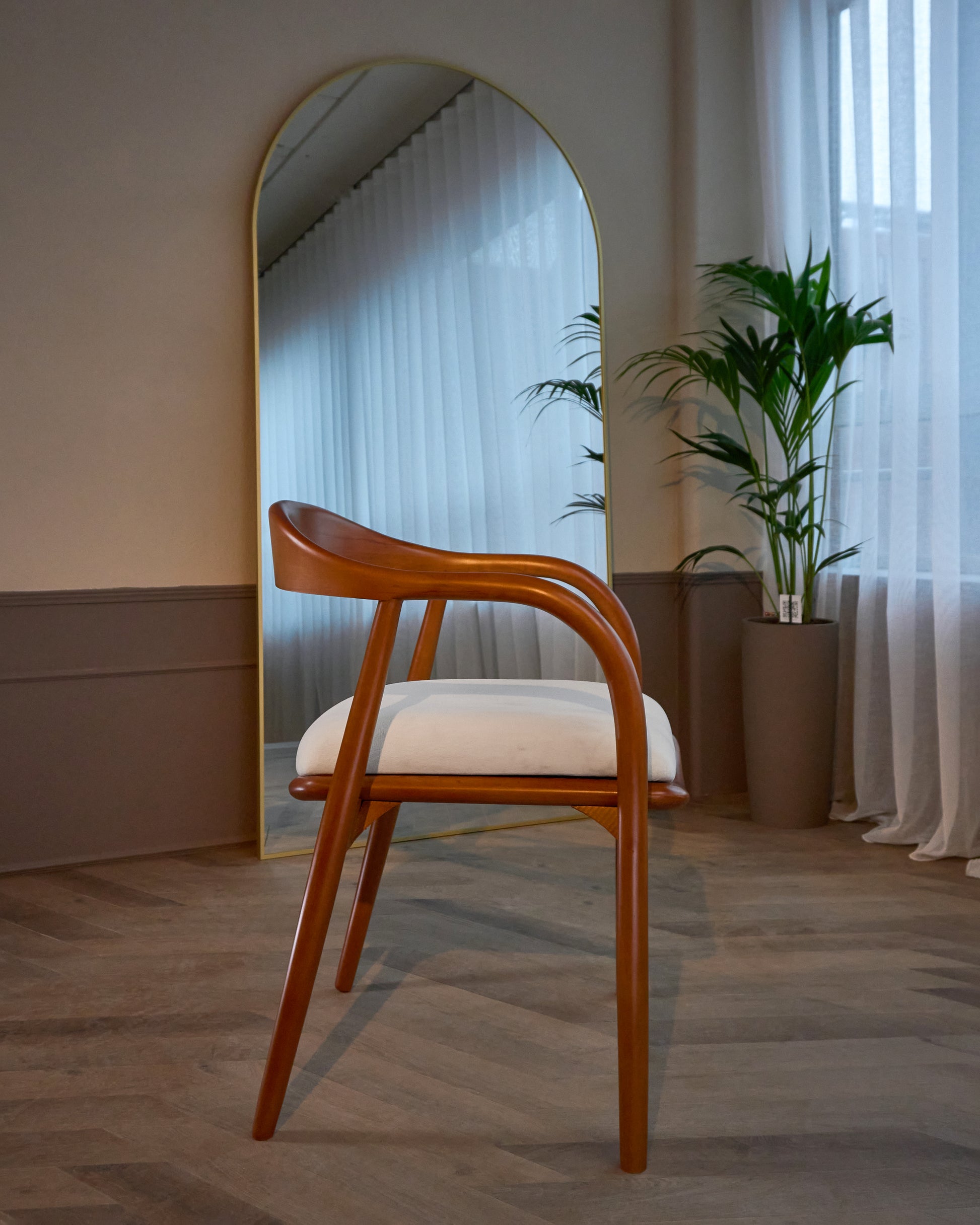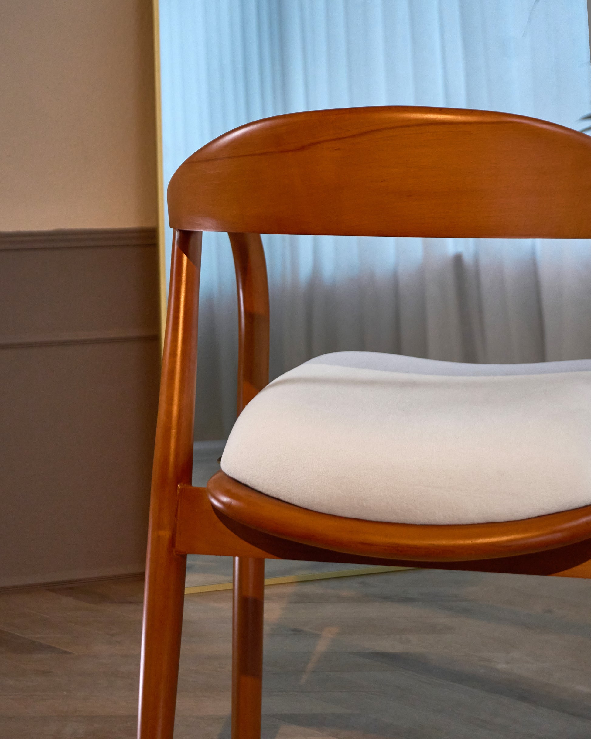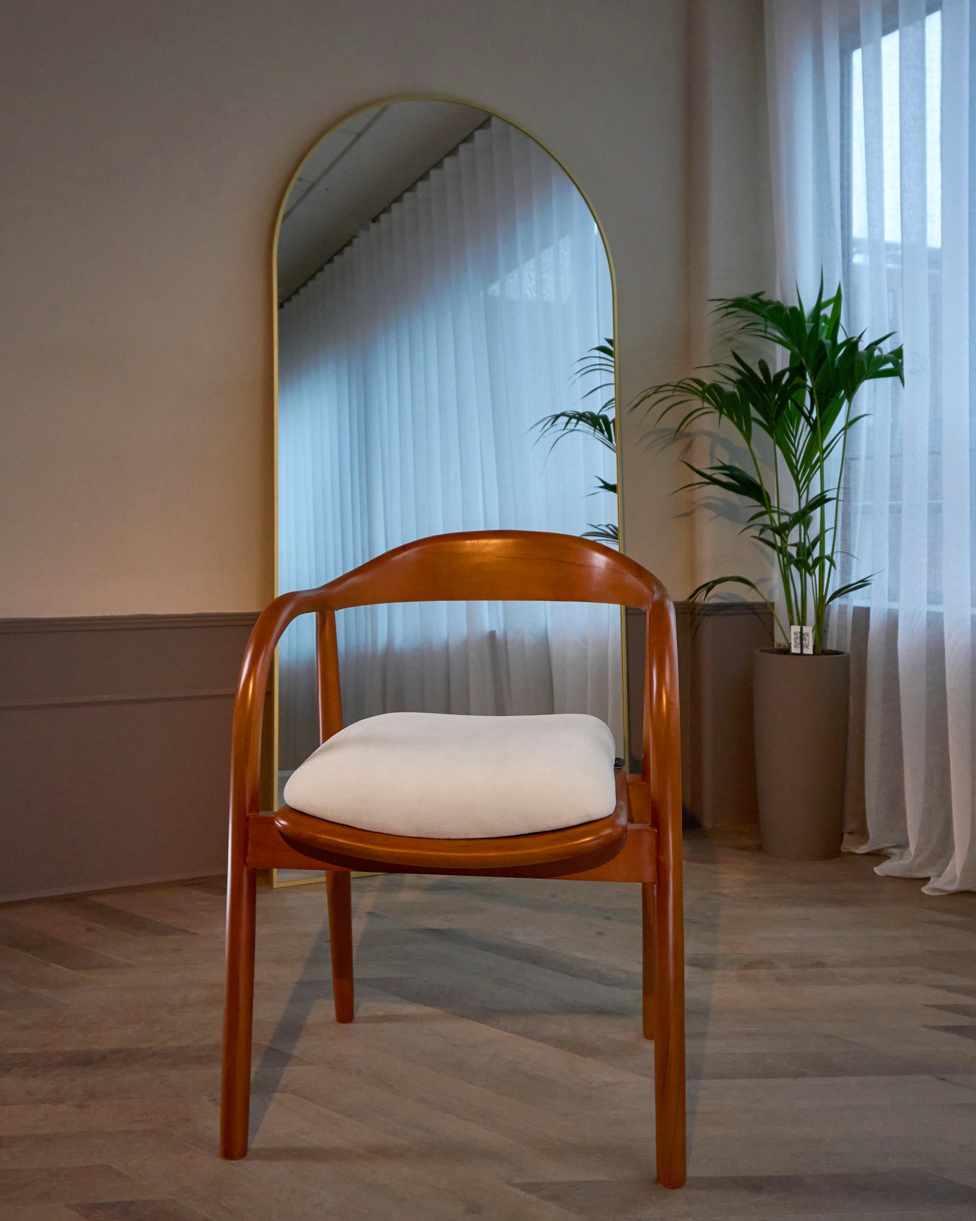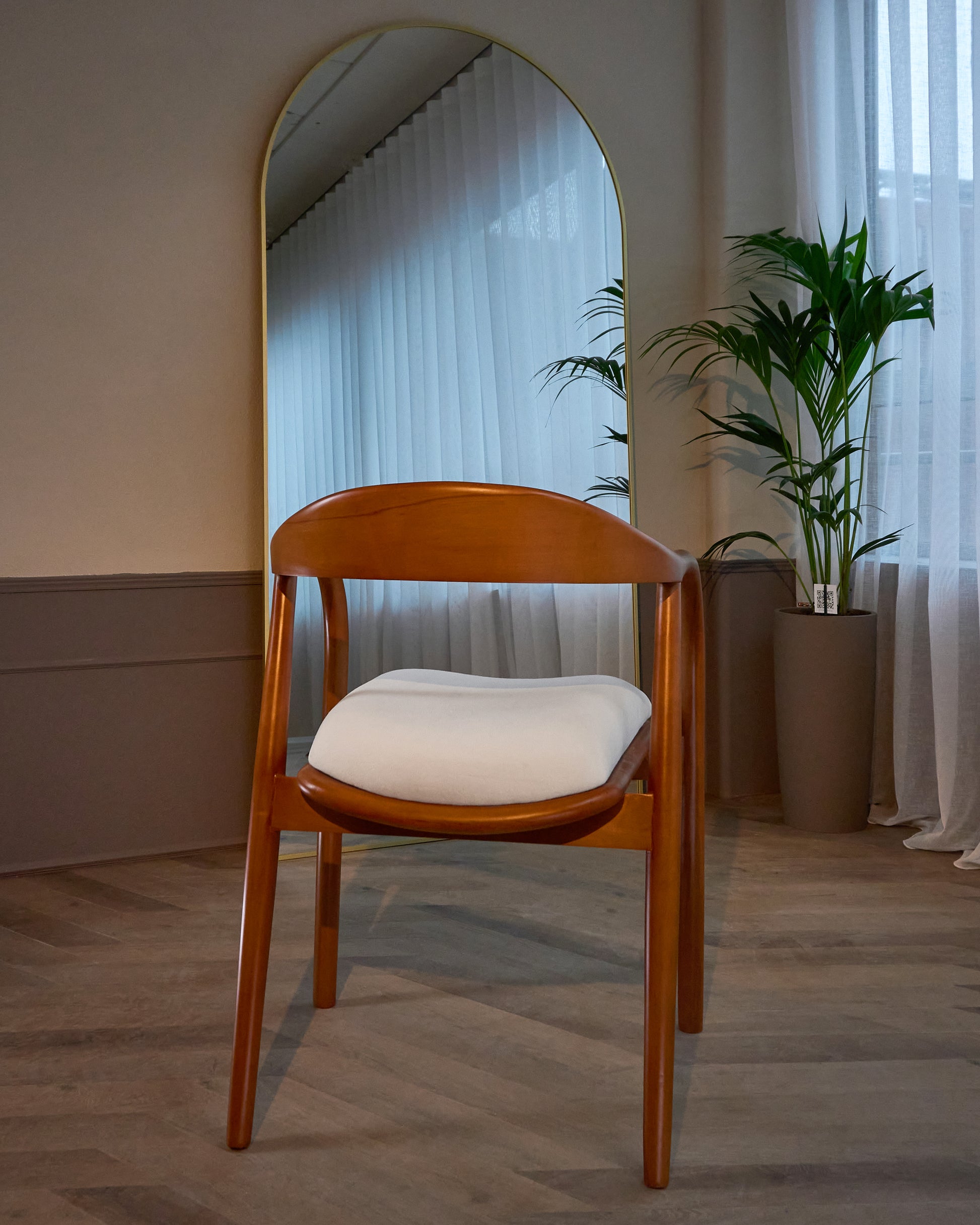 De Kyoto eetkamerstoel combineert Japans minimalisme met tijdloze elegantie. De afgeronde rug- en armleuningen vloeien soepel in elkaar over en zorgen voor een comfortabele zitervaring. Een stoel die rust en verfijning uitstraalt, en perfect tot zijn recht komt aan een moderne eettafel.