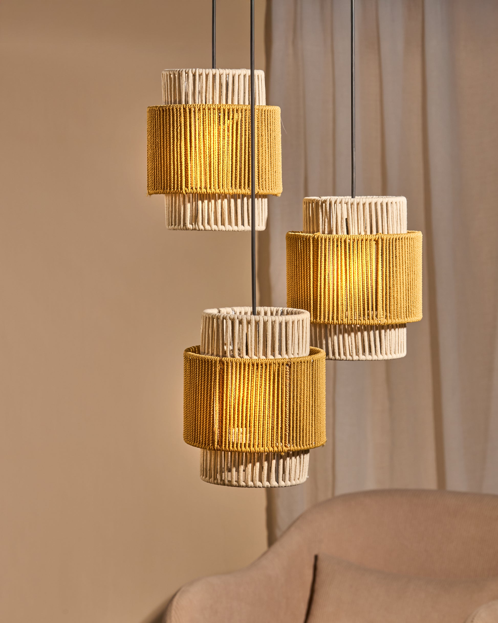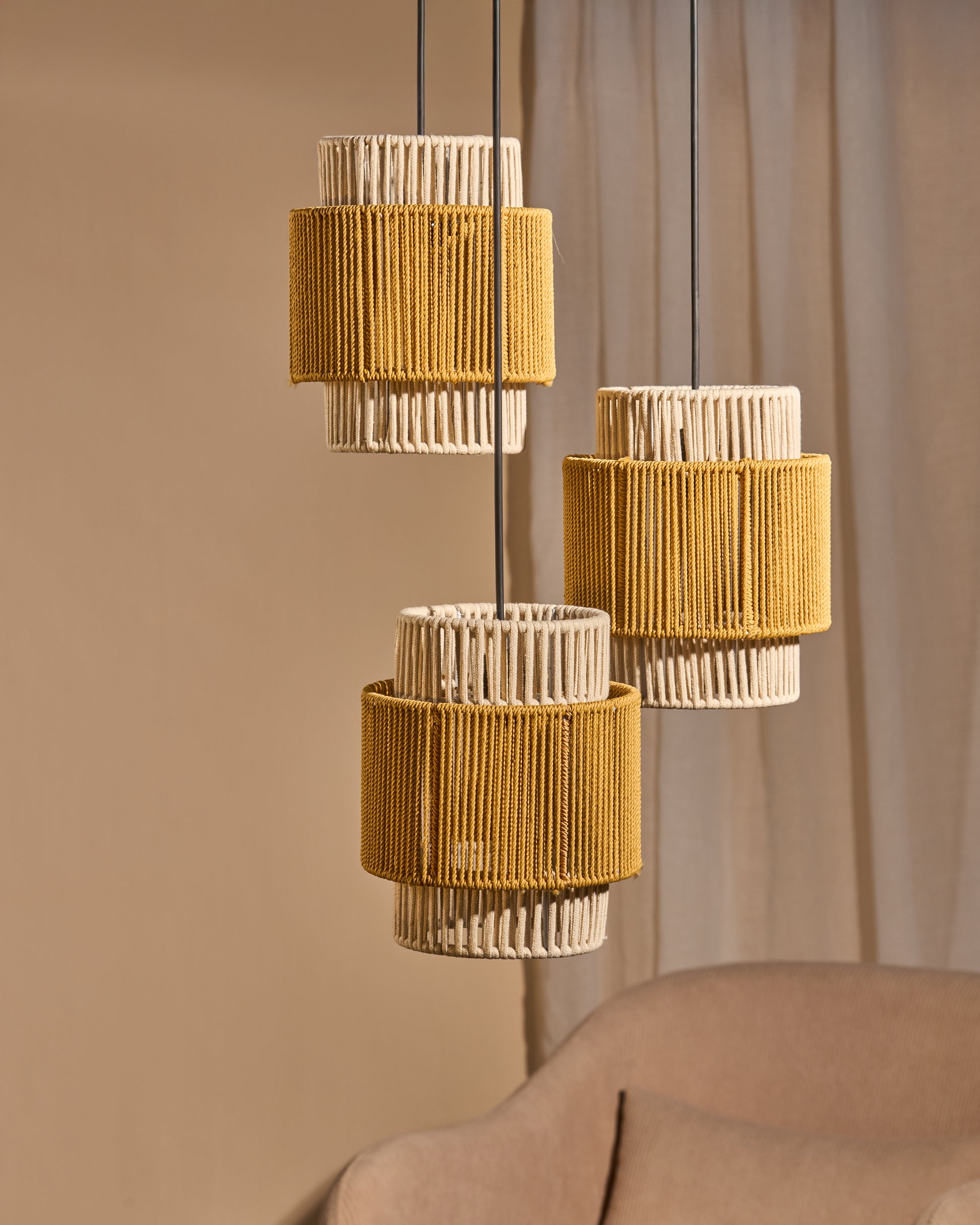 Deze hanglamp is met de hand gemaakt van een combinatie van naturel touw en mosterdgele katoendraden. De cilindervormige kap krijgt een speels accent door de brede kleurband in het midden. Een warme en frisse toevoeging die elke ruimte tot leven brengt.