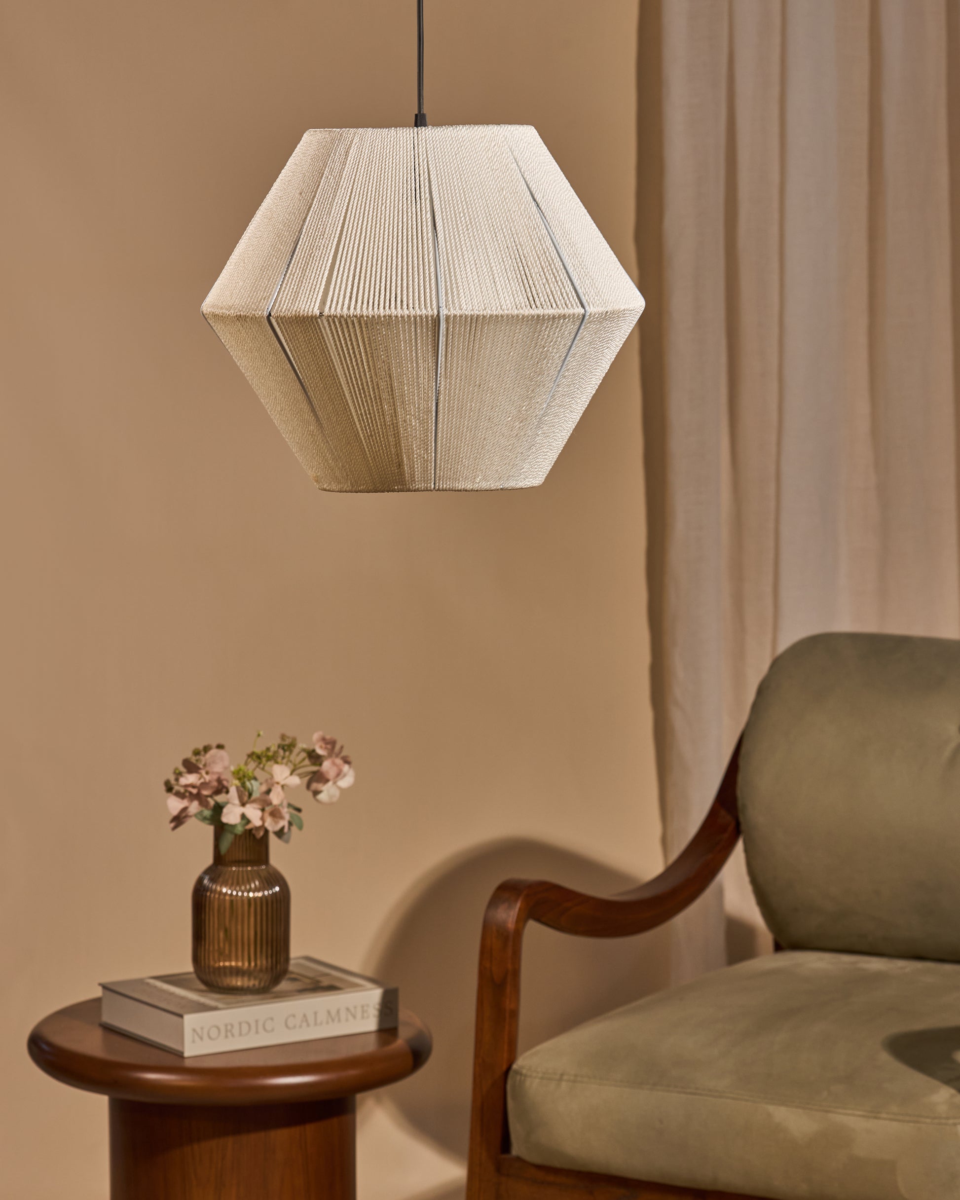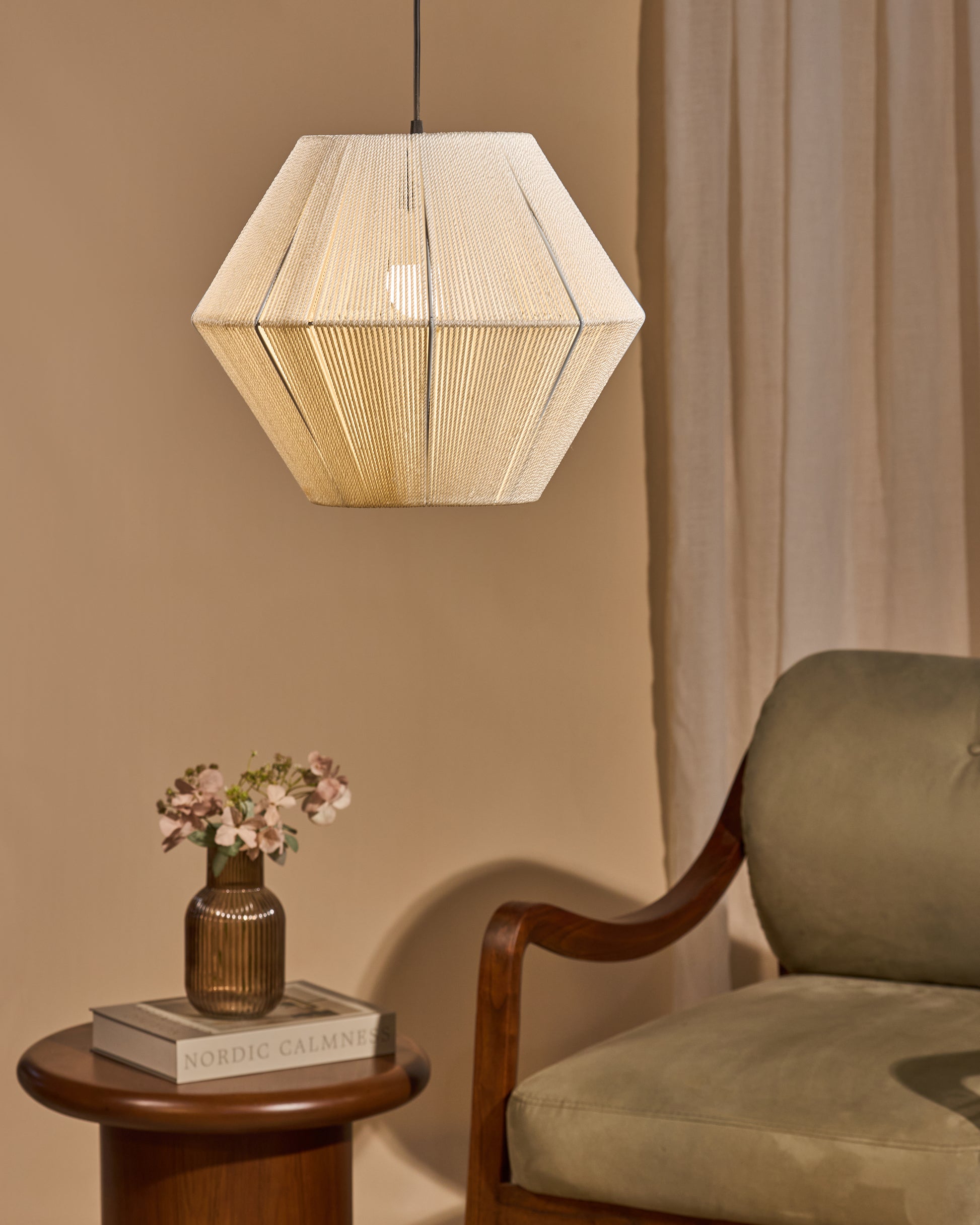 Deze zwarte hanglamp is met de hand vervaardigd en gemaakt van strak gespannen macramédraad. De drie geometrische vormen zorgen samen voor een krachtig en modern silhouet, terwijl het licht subtiel doorspeelt tussen de draden. Een stijlvolle blikvanger die rust en karakter toevoegt aan je ruimte.