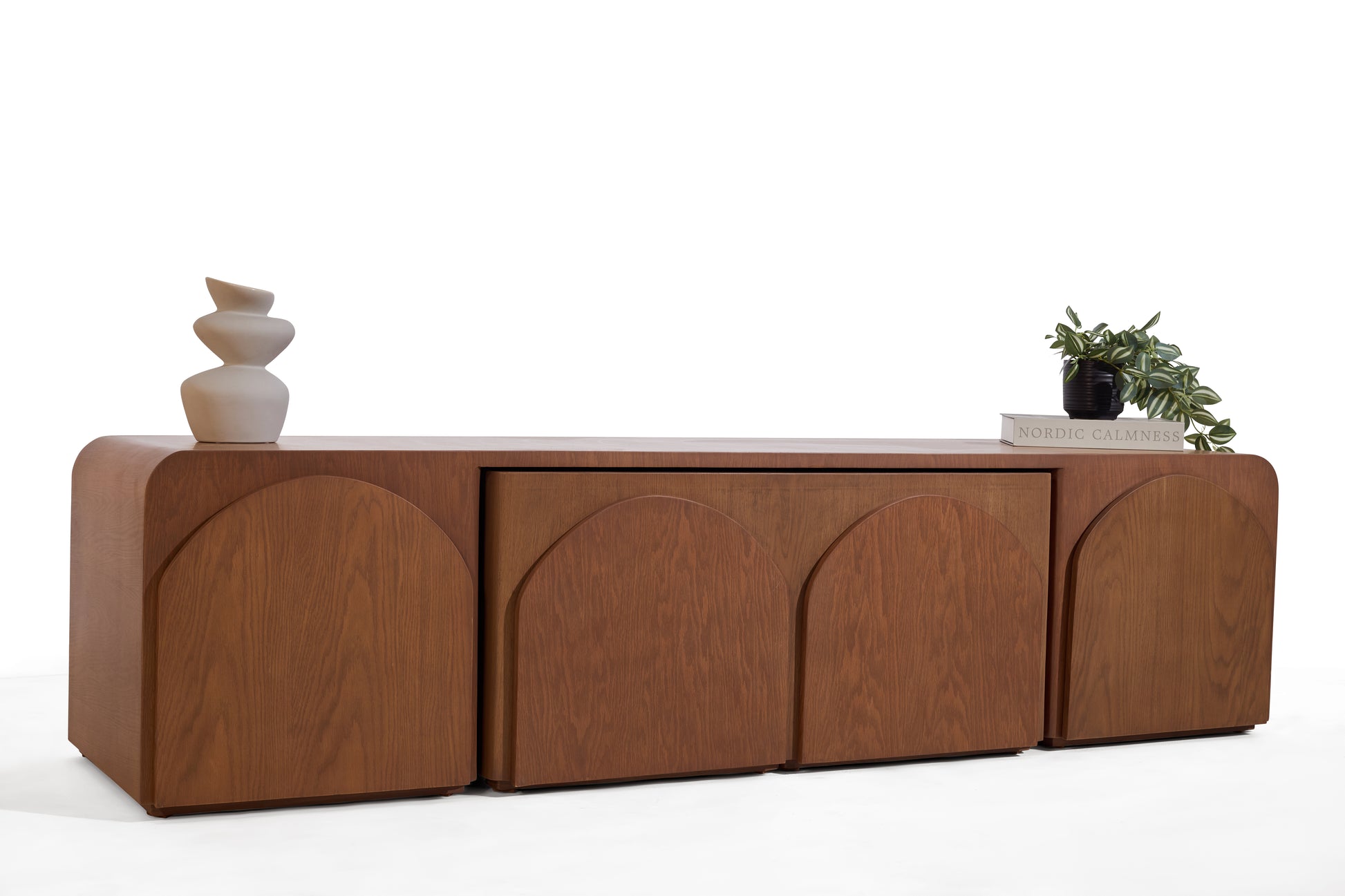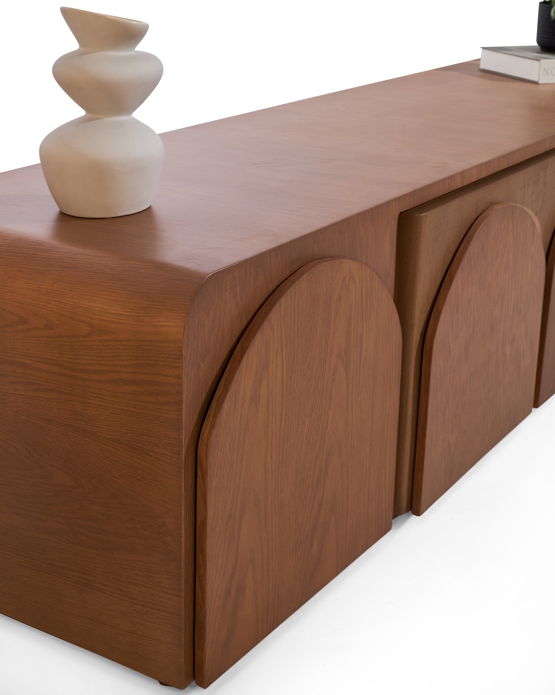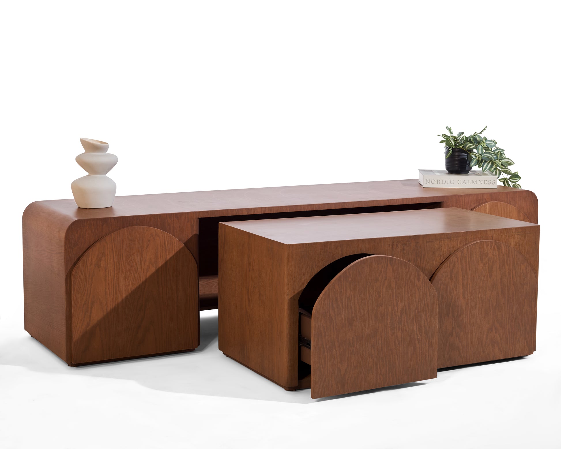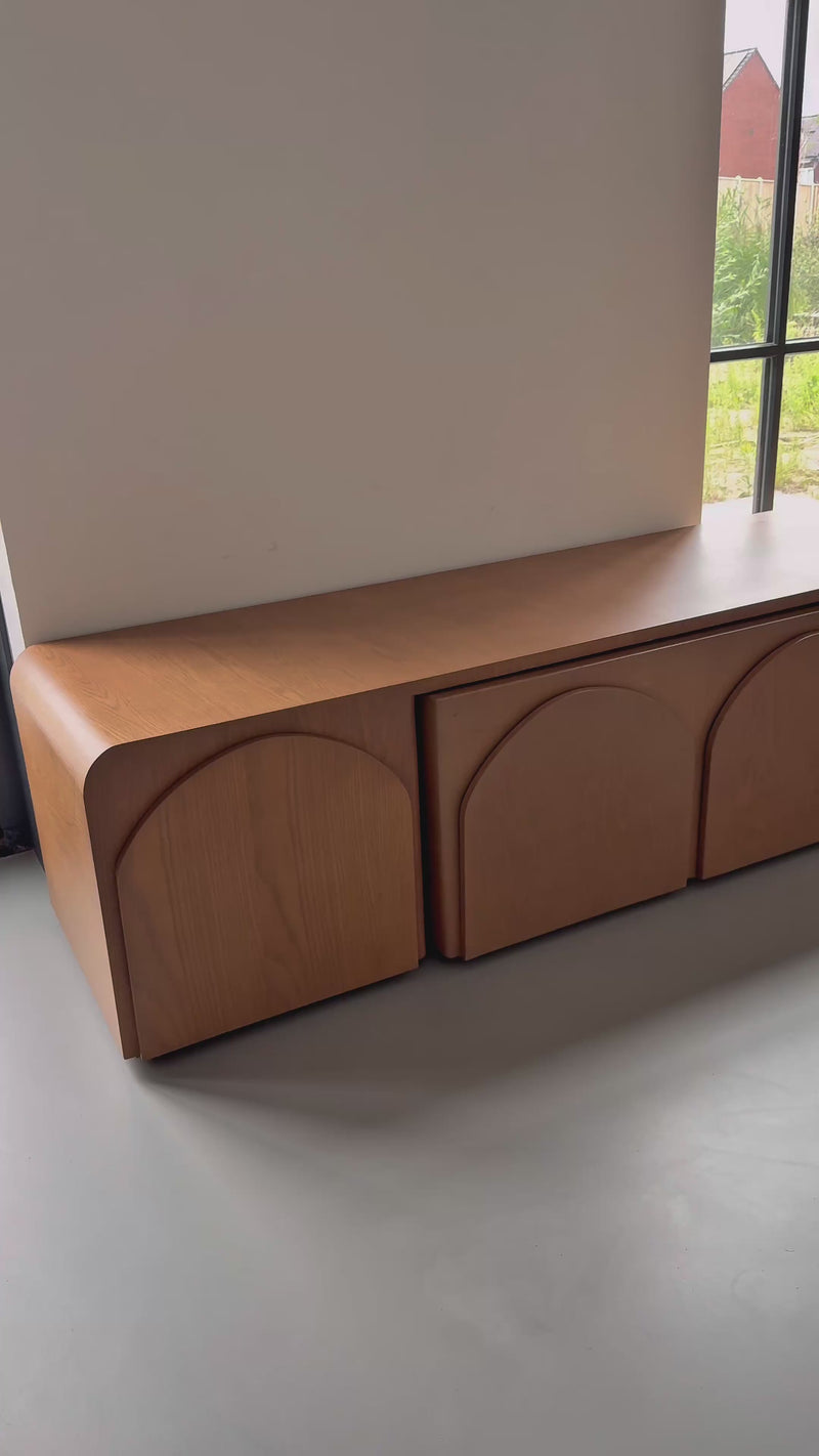 Een innovatief meubel dat design en functionaliteit moeiteloos samenbrengt. Deze tv-unit verbergt twee salontafels die je gemakkelijk uitschuift wanneer je extra tafelruimte nodig hebt, en weer inschuift om ruimte vrij te maken in huis. Het meubel straalt een warme Japandi-uitstraling uit, met een natuurlijke houtlook die in elke nerf een verhaal vertelt. Volledig handgemaakt, ontworpen voor een interieur waarin rust en karakter samenkomen.