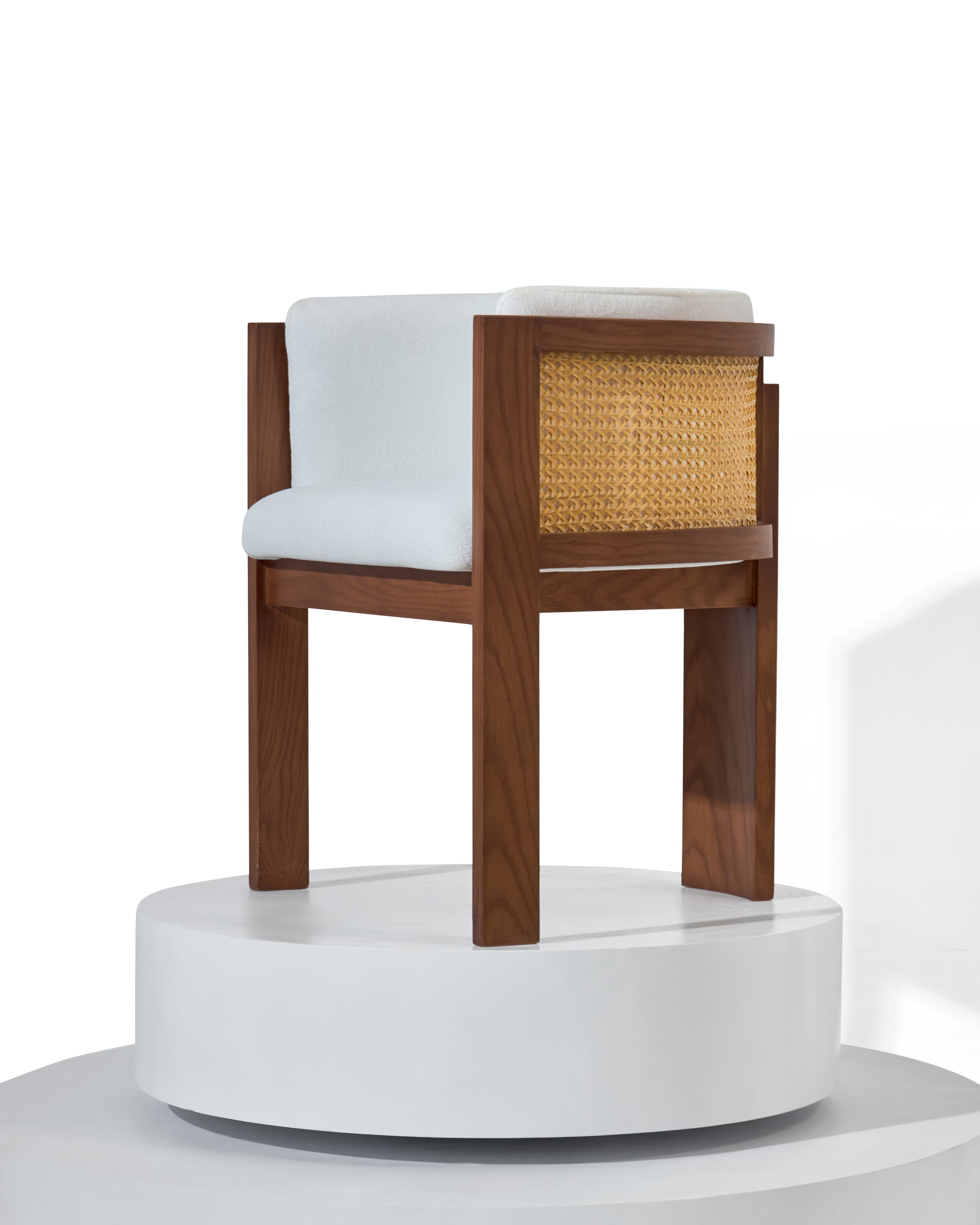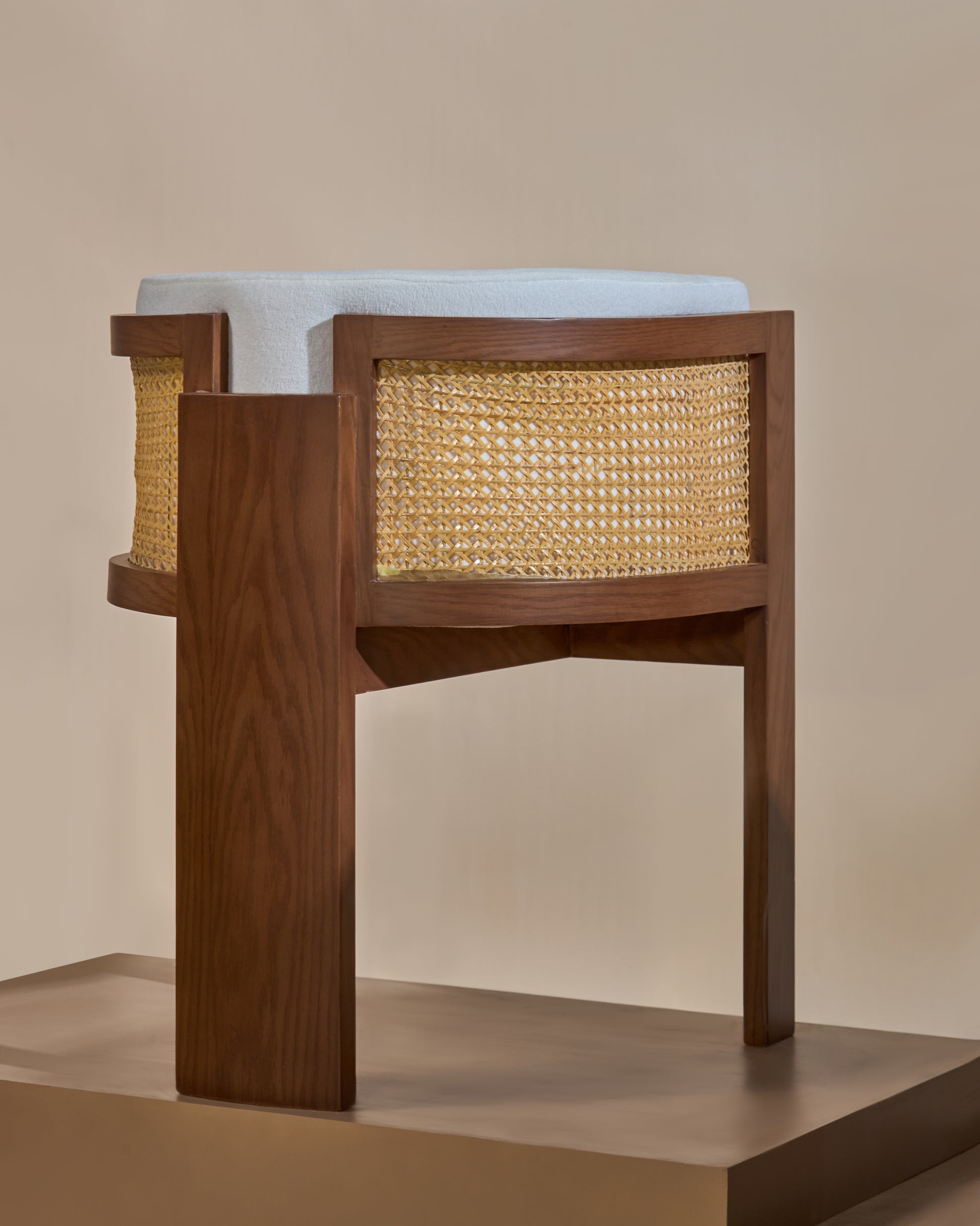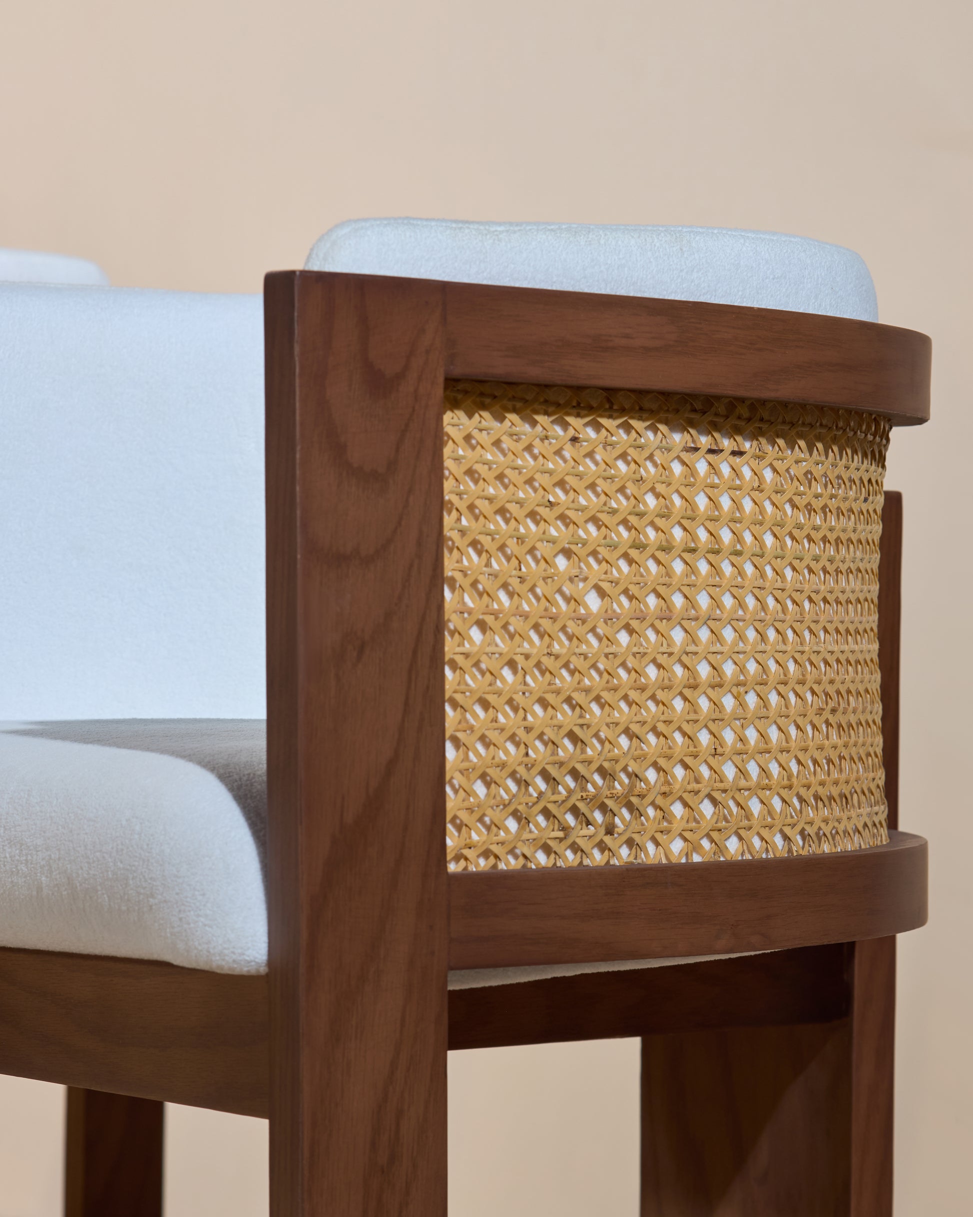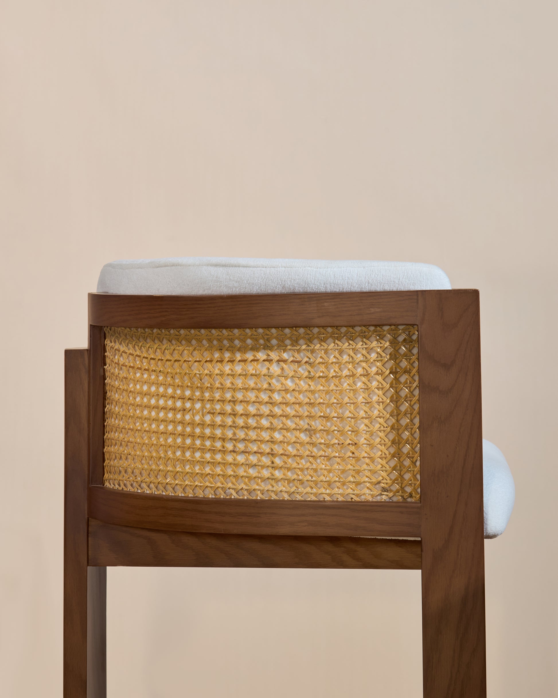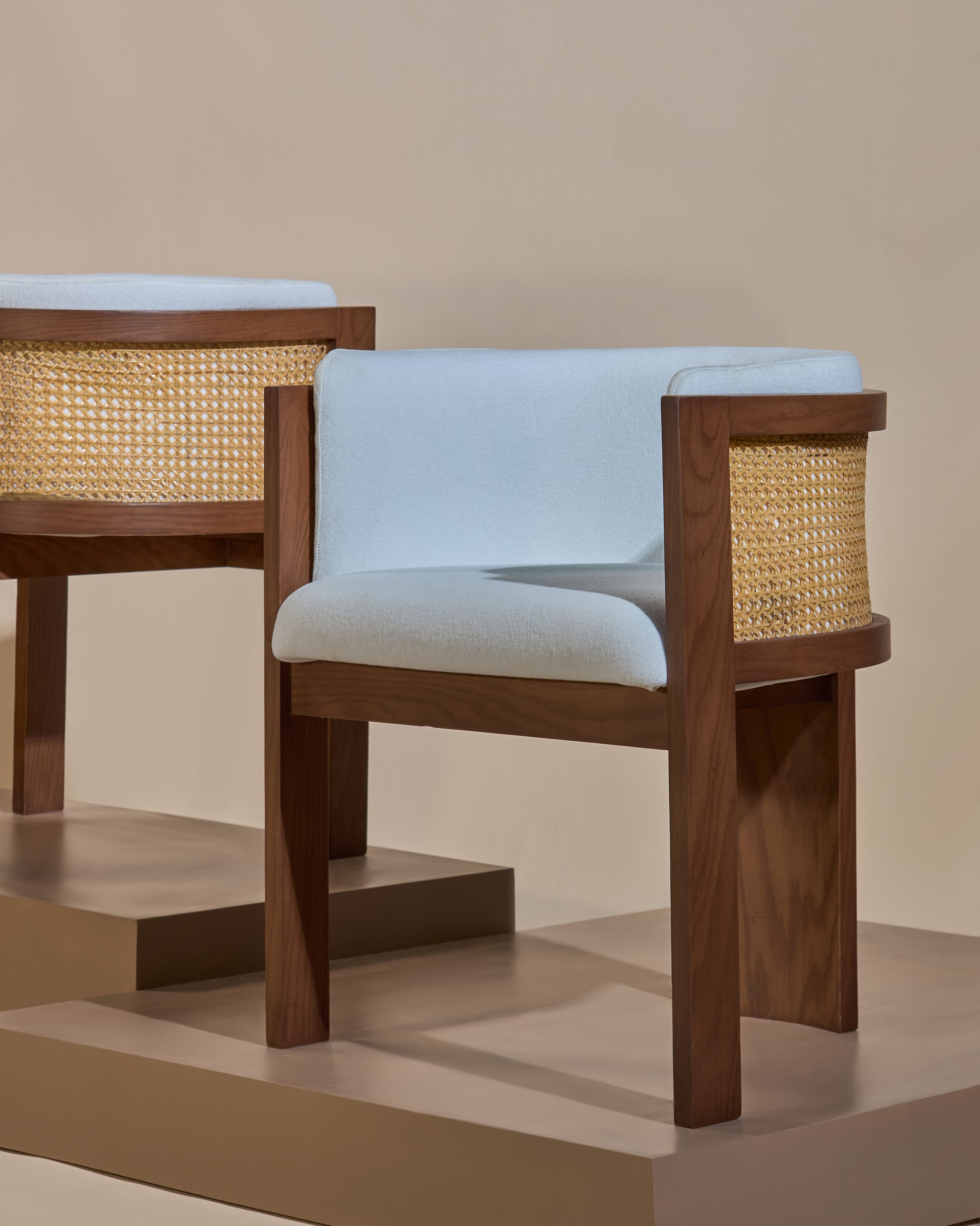 De Saga eetkamerstoel brengt warmte en karakter in de ruimte. Het stevige houten frame in combinatie met het handgeweven rotan rugpaneel geeft de stoel een ambachtelijke uitstraling, met een subtiel vintage accent dat opvalt zonder te overheersen.